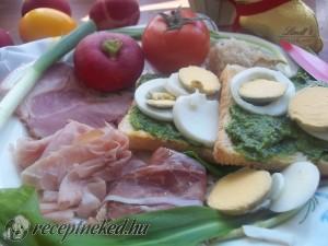Gyors ételek receptjei Hidegtálak Sertés receptek Húsvéti reggeli sonkával, tojással, pestos toasttal