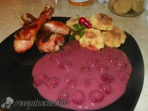 Mézes sült csirkecomb meggymártással és szalonnás burgonyafánkkal