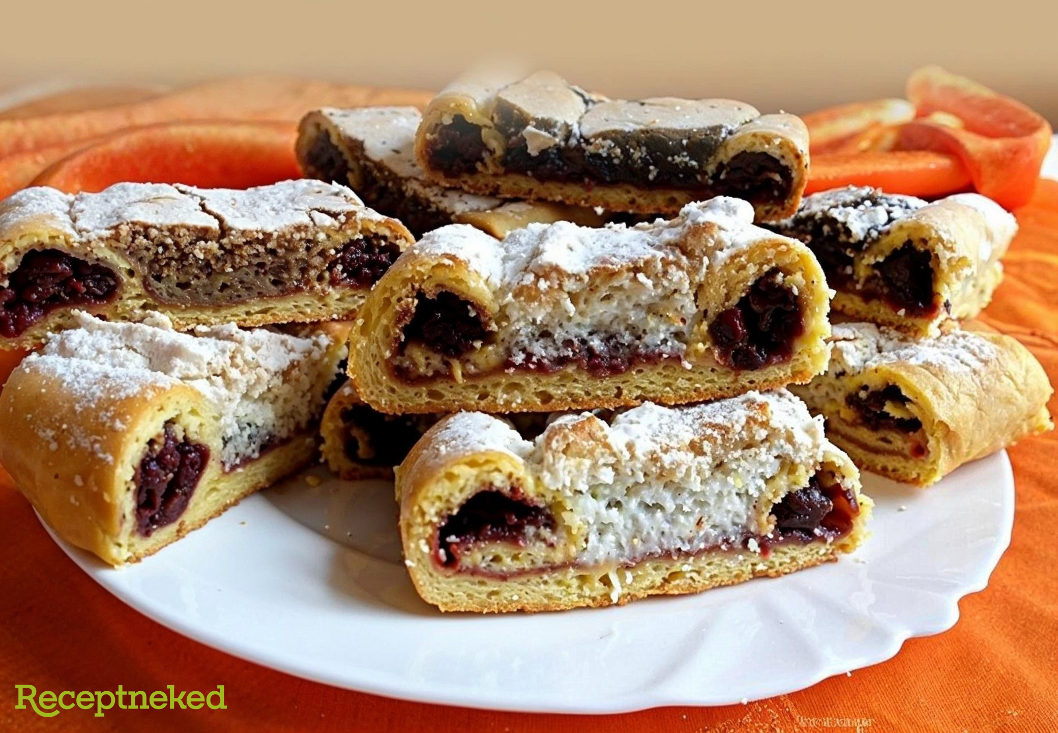 A tésztákat egyenként kinyújtjuk kb 18*34 cm-es lappá és lekvárral megkenjük. Alaposan lecsepegtetett meggyszemekkel a két oldalát kirakjuk, majd a tésztát mindkét oldalról felhajtjuk a tészta közepe felé. A tészta közepén egy kb 6 cm-es sávot szabadon hagyunk a tölteléknek.