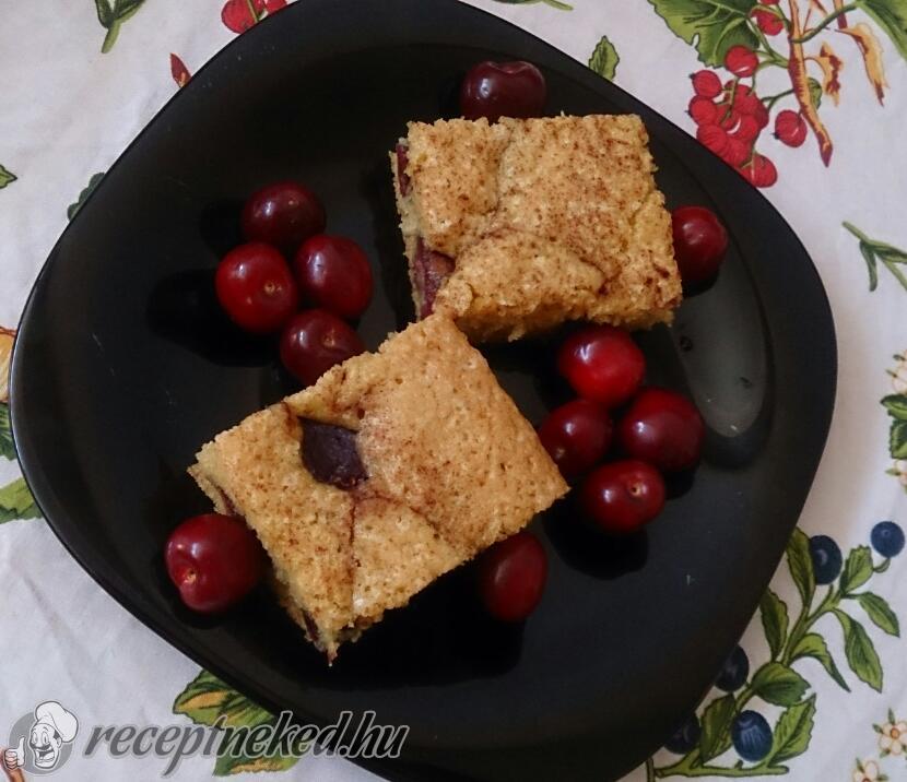 A hozzávalókat összekeverjük egy keverőtálban, és sütőpapírral kibélelt normál méretű tepsibe öntjük. Elegyengetjük, majd rászórjuk a gyümölcsöt (ez esetben meggy). Megszórjuk fahéjjal a tetejét.