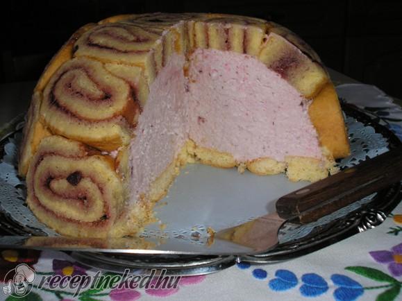 A piskótatekercsekkel bélelt edénybe kanalazzuk a krémet, a tetejét a félretett tekercsekkel zárjuk. Egy éjszakára, de legalább 5-6 órára hűtőbe tesszük, majd tálcára borítjuk és a maradék krémmel díszítjük. Én ezt pár csepp kék ételfestékkel színeztem.