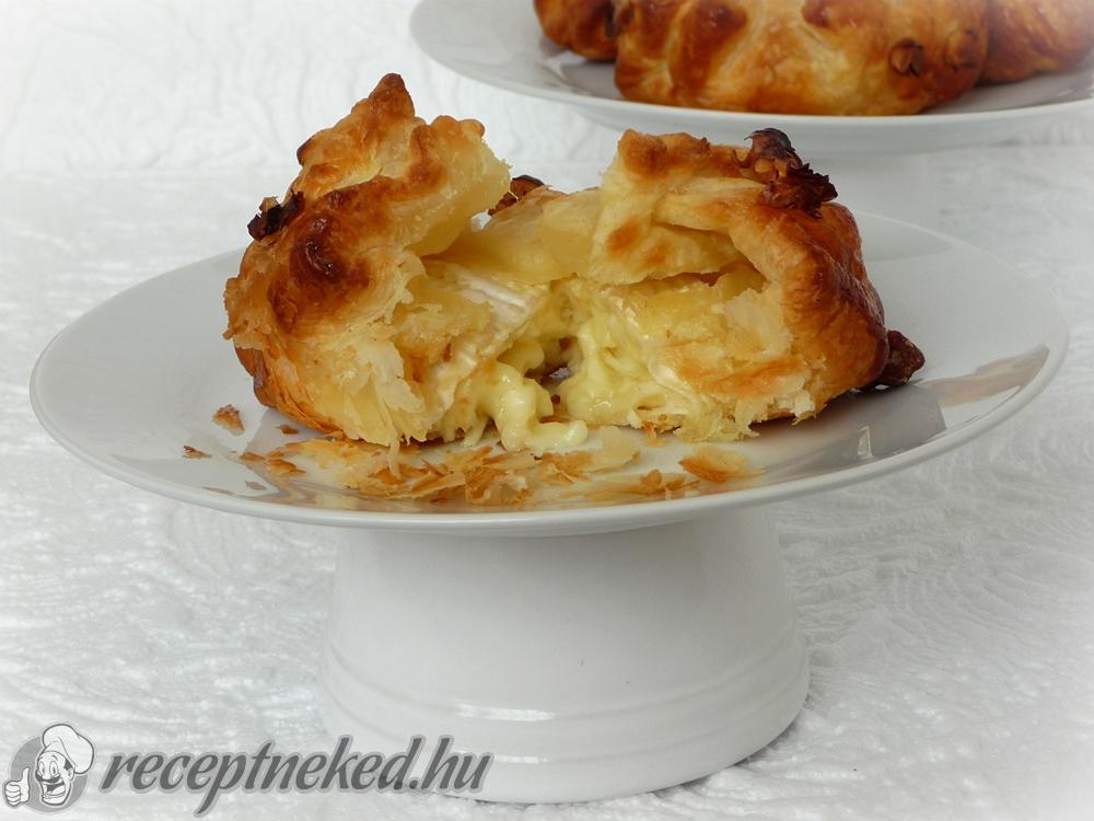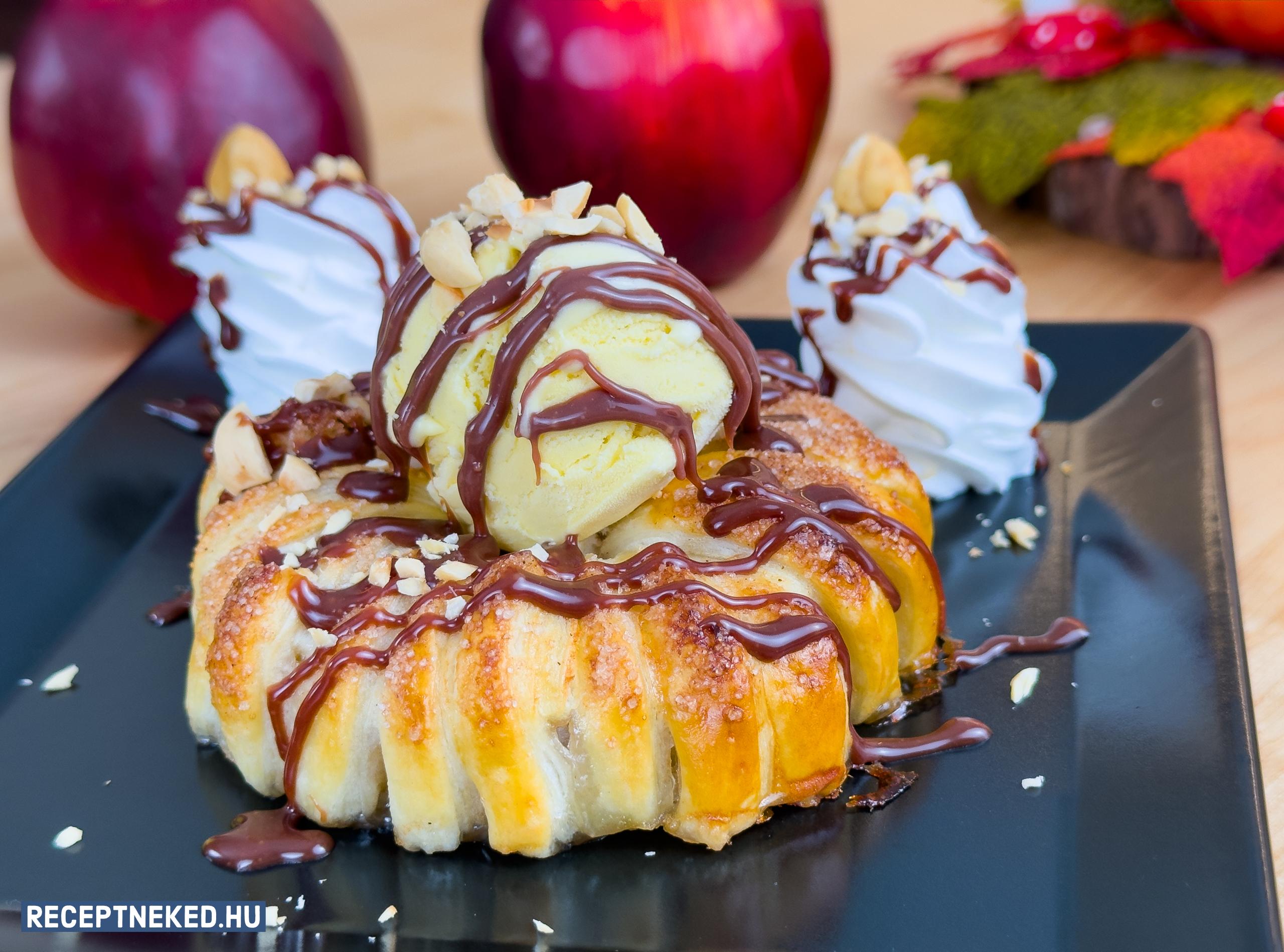 Az almákat meghámozzuk, magházukat eltávolítjuk. Az almák húsát fél cm-es szeletekre vágjuk, majd egy kisebb szaggatóval a közepét kivágjuk és citrommal meglocsoljuk.A felolvasztott leveles tésztát lisztezett felületen kinyújtjuk és derelyevágóval ízlés szerinti vastagságú csíkokra vágjuk.A kétféle cukrot a fahéjjal összekeverjük, majd az almakarikákat megforgatjuk benne és a tésztacsíkokkal körbetekerjük.Sütőpapírral bélelt sütőlemezre rakjuk, az áttekert karikákra a kivágott almák közepét ráhelyezzük, felvert tojással lekenjük és előmelegített 200 fokos sütőben készre sütjük.Tálaláskor vaníliás porcukorral megszórva kínáljuk.Tipp: díszítésként 20 gramm vaníliaízű pudingpor, 2 dl almalében felfőzve ízlés szerint cukorral.