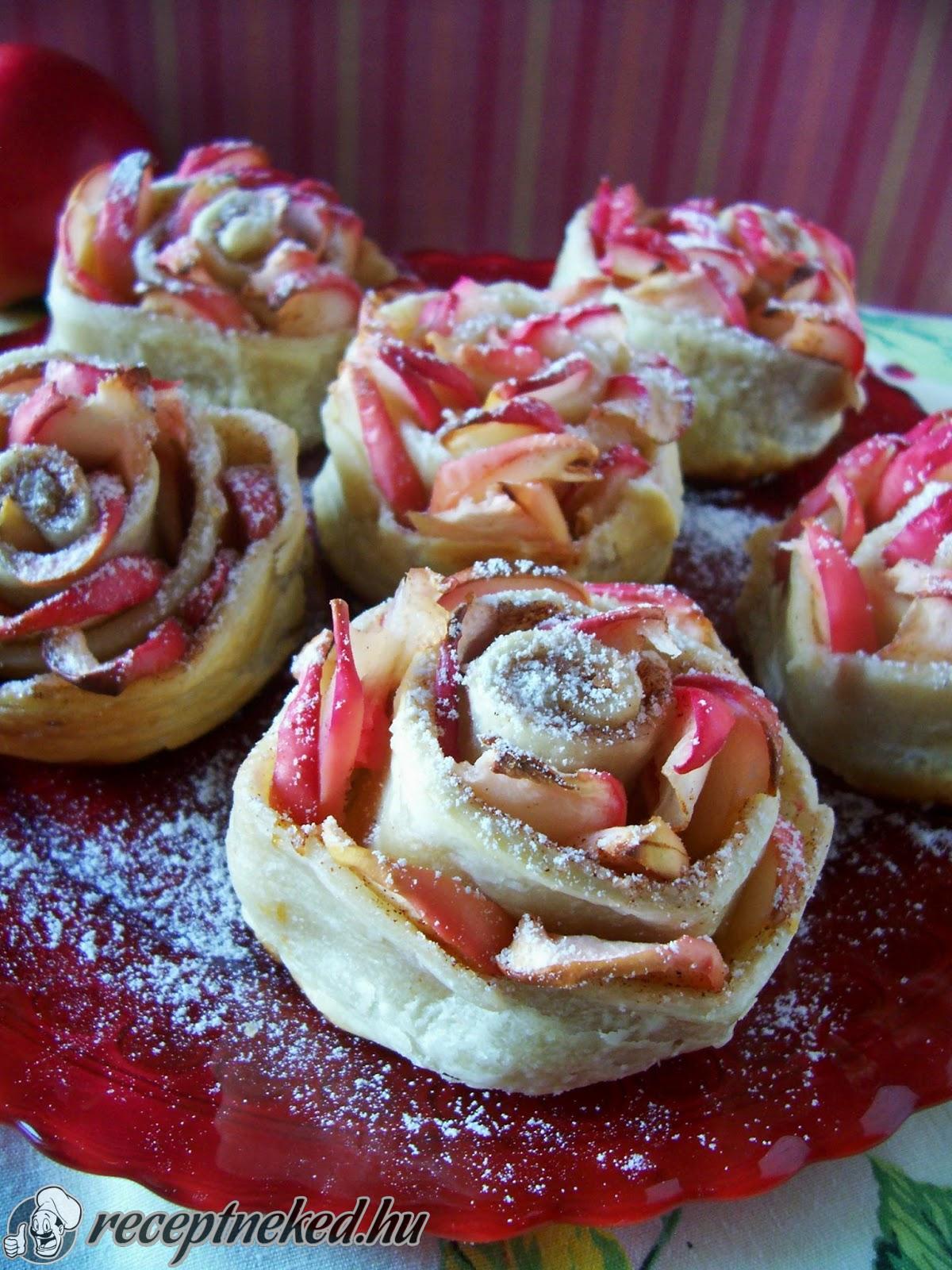 Megmossuk, kicsumázzuk és vékonyan felkarikázzuk az almákat. Almakarikákat egymásra csúsztatva fektetünk a tésztalapokra, picit belenyomkodjuk a tésztába. A legelső almakarika 1 cm-rel lógjon le a tésztacsíkról.