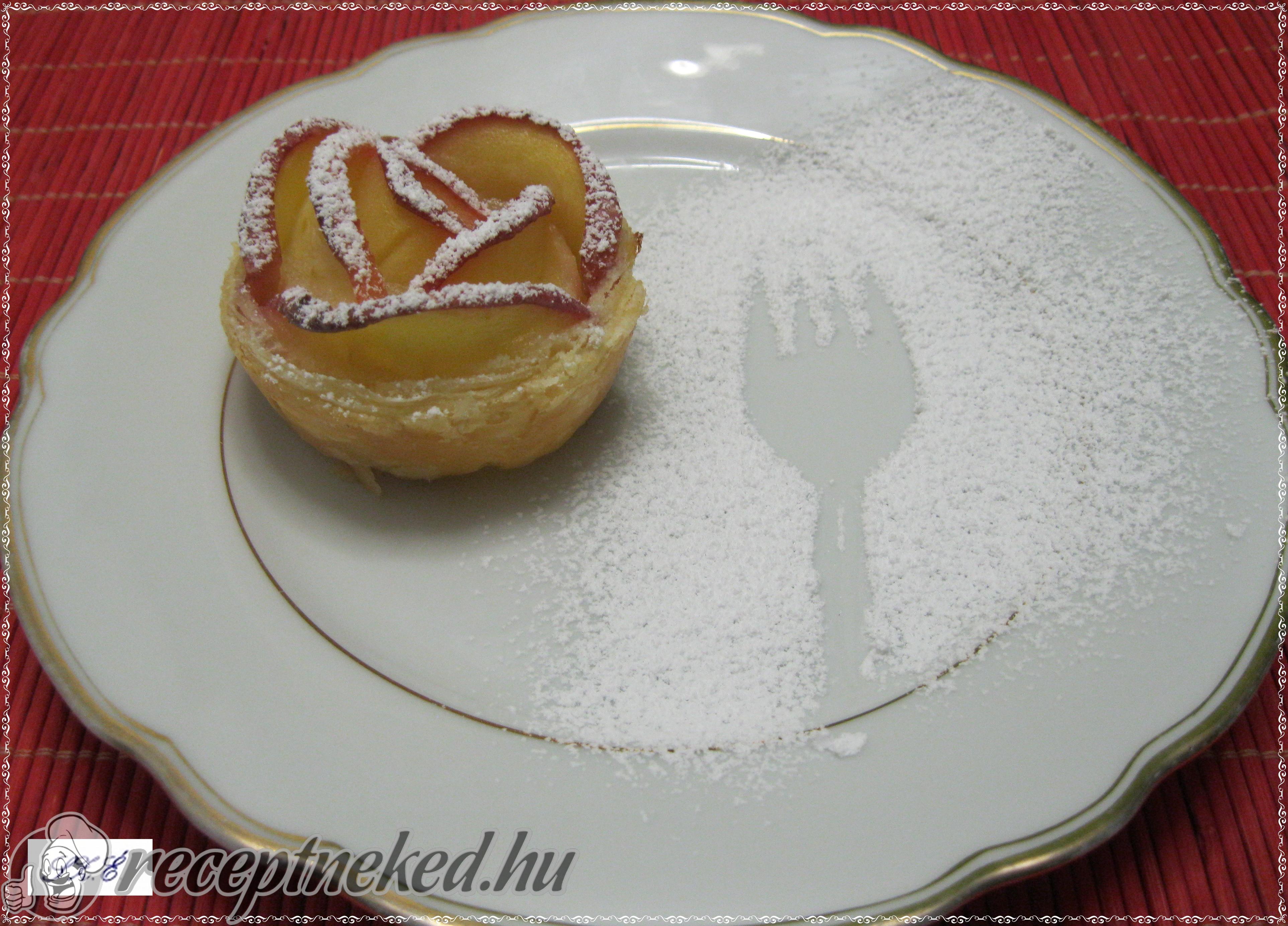 A leveles tésztát kinyújtjuk, megkenjük olvasztott vajjal, majd megszórjuk cukorral. Ezután 3 cm széles csíkokra vágjuk. Az almaszeleteket a tésztacsíkokra fektetjük úgy, hogy kissé kilógjanak a széléből, majd szorosan feltekerjük.