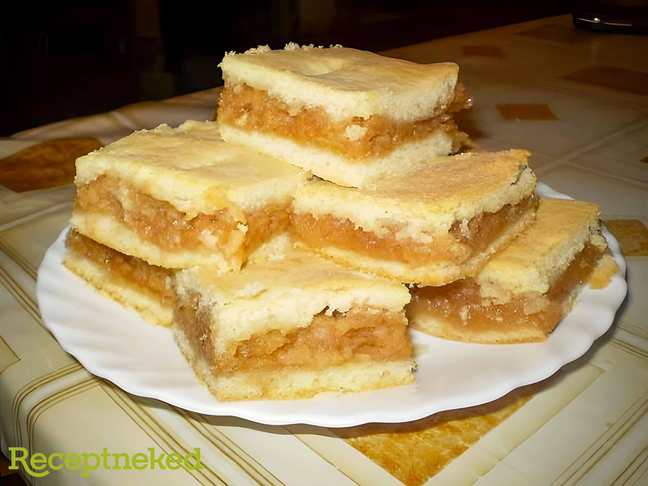 Az egyik kinyújtott lappal kibéleljük a zsírozott, búzadarával megszórt 35*30 cm-es tepsit, rátesszük az ízesített és kinyomkodott almát, majd befedjük a másik kinyújtott tésztalappal.