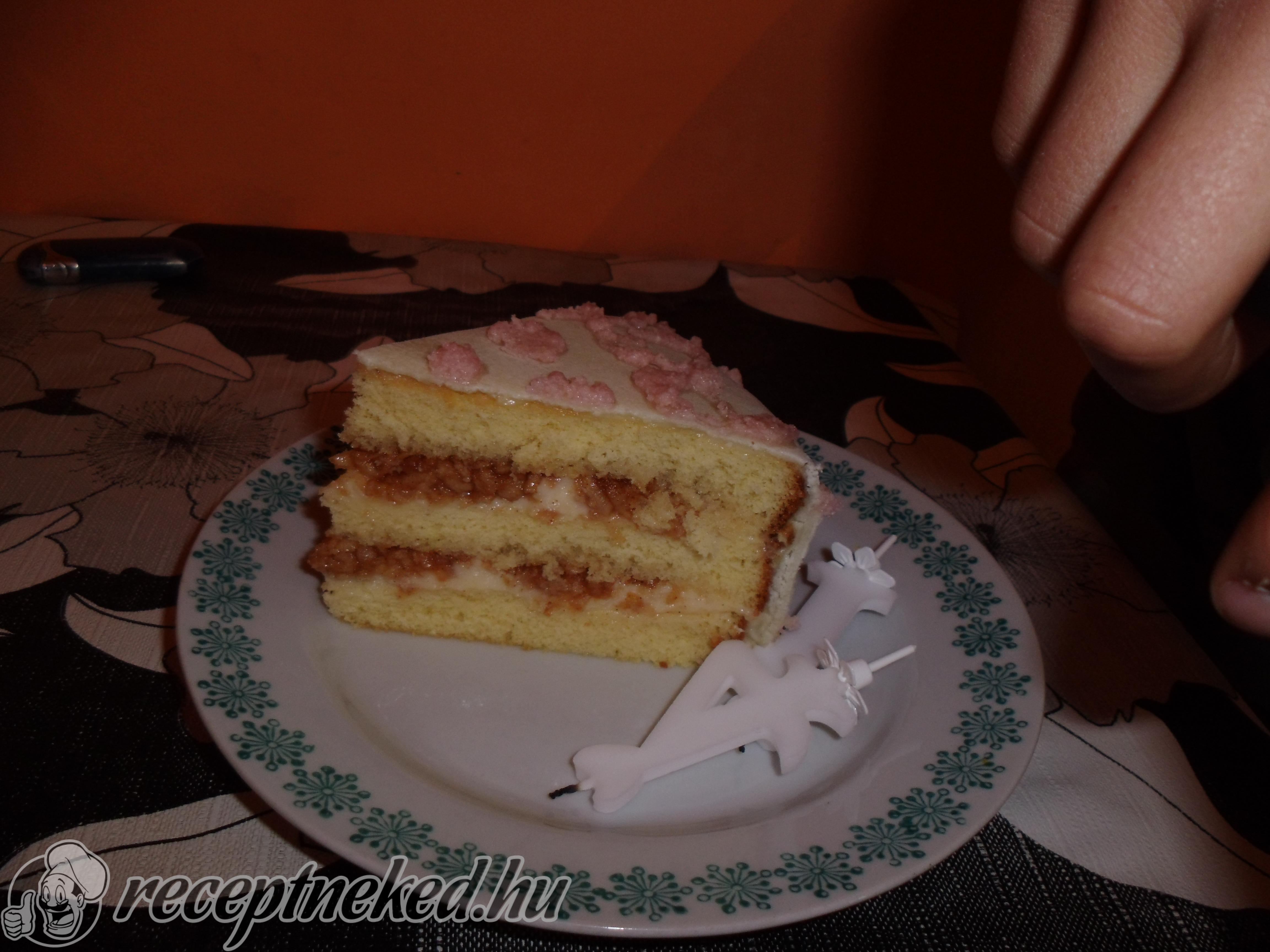 A tésztát vajjal kikent, lisztezett, 24 cm-es formába öntjük és elsimítjuk. Előmelegített sütőben 180 fokon tűpróbáig sütjük. Ha kész kihűtjük, ha kihűlt 2 vagy 3 lapba vágjuk.
