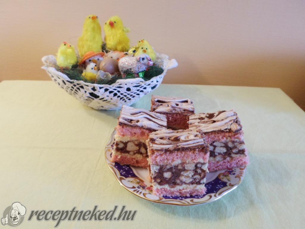 Az egyik piskótára kenjük a krém felét, majd rásimítjuk a kekszes tölteléket, a maradék krémet, végül befedjük a piskótával.