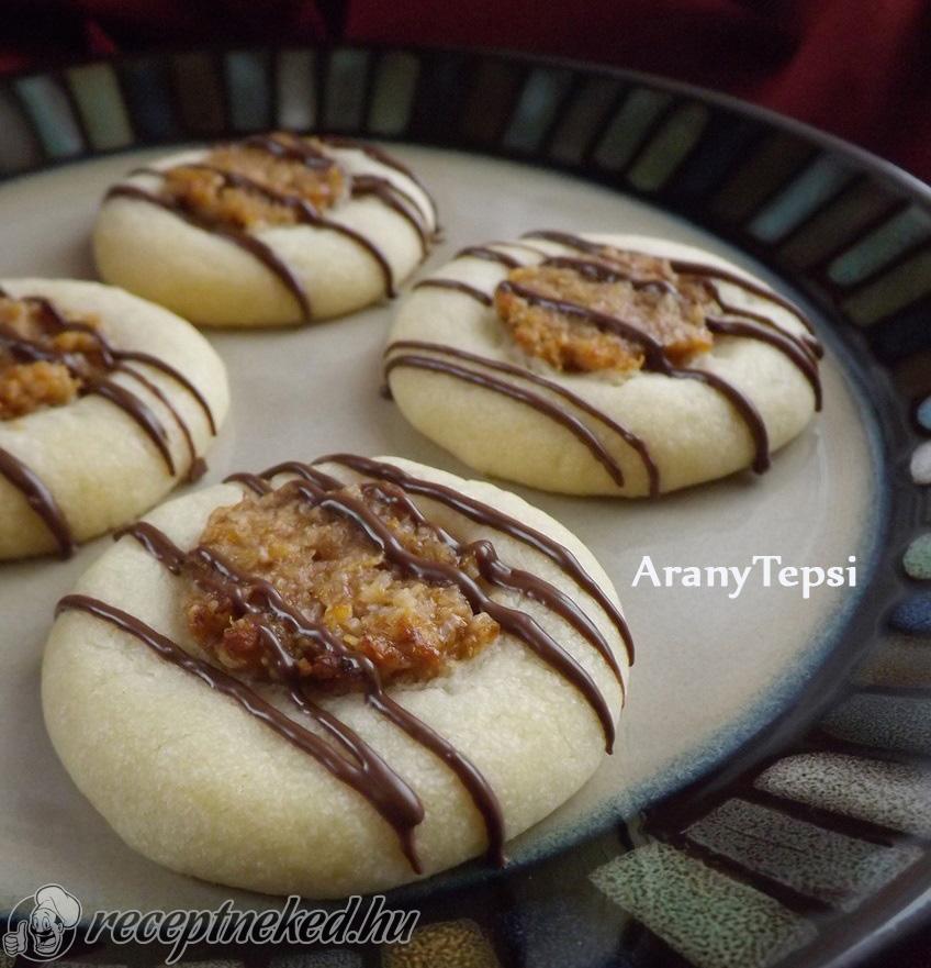 A sütiket az előkészített sütőlapra helyeztem egymástól egy kicsit távolabb, mert sütés közben szétterülnek. Ezután a lyukakat megtöltöttem a diós töltelékkel (kb 1 kávéskanálnyit teszünk mindegyik sütibe).