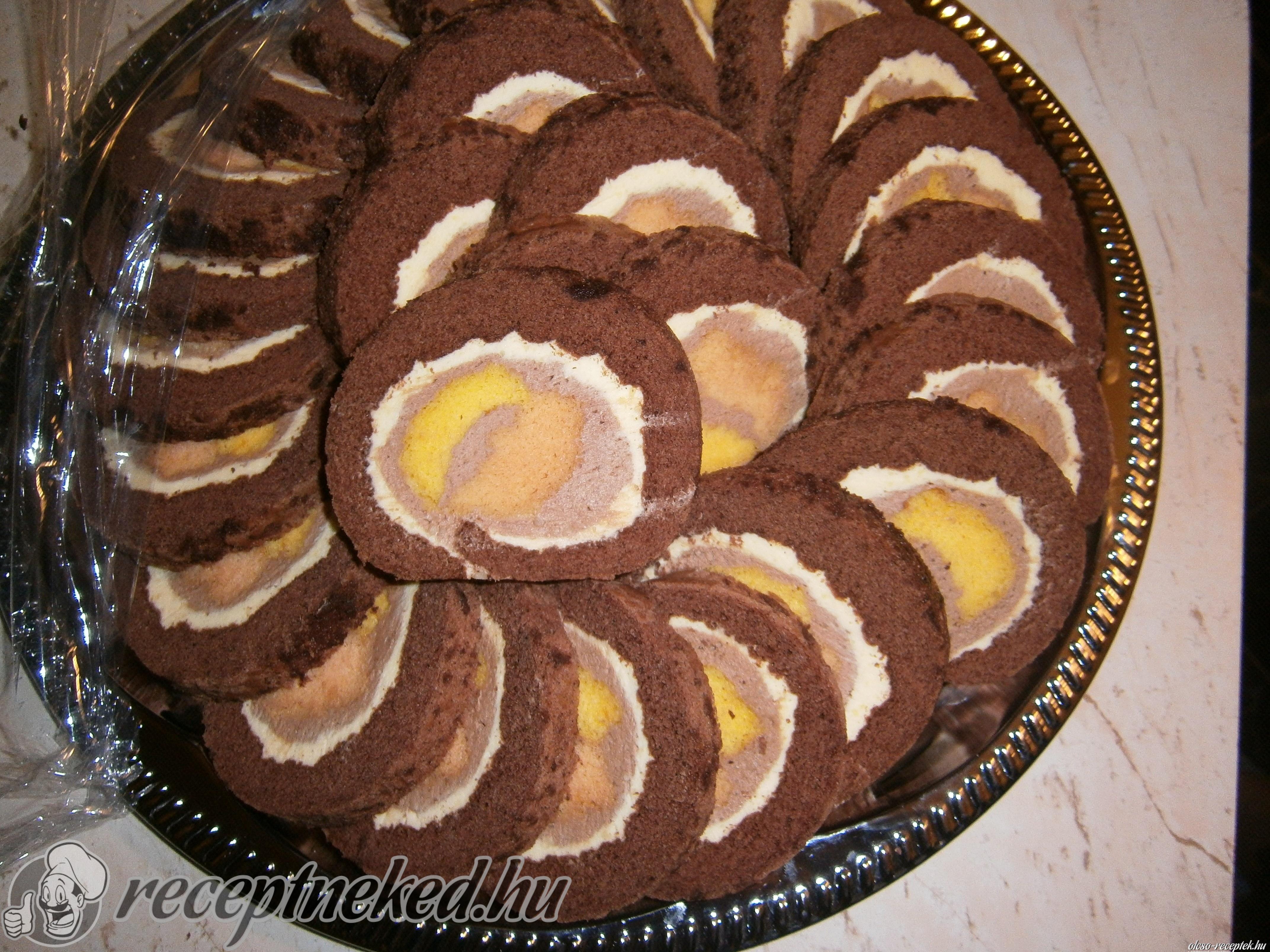 Készítünk két darab, öt tojásos piskótalapot is, amelyekbe két csomag csokis pudingport keverünk. Ezeket a barna lapokat nagy gáztepsiben sütjük ki, és amikor kisültek, még melegen feltekerjük őket.