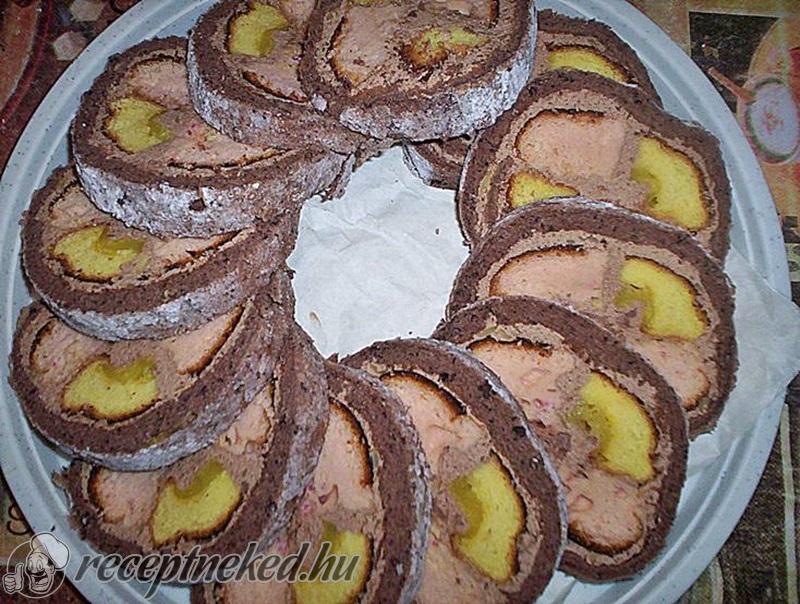 A rudakat egymással színben ellentétesen a kakaós krémmel összeragasztjuk. Rózsaszín mellé a sárgát, és szemben ugyanígy, hogy egy hengert kapjunk.
