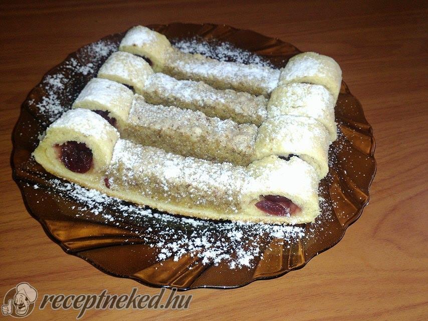 A tésztákat egyenként téglalap alakúra, kb 2 mm vastagra nyújtjuk. Megkenjük baracklekvárral az egészet és a két szélére magozott meggyet teszünk.
