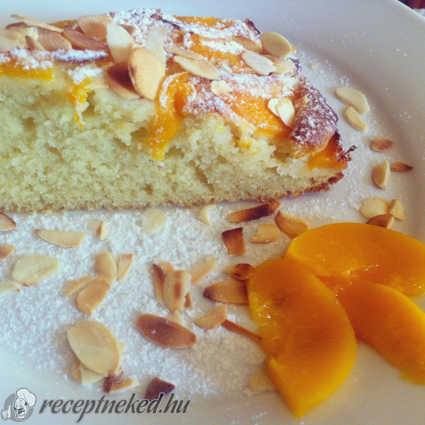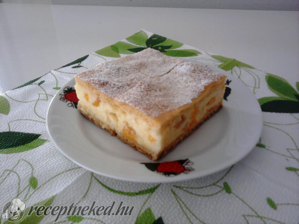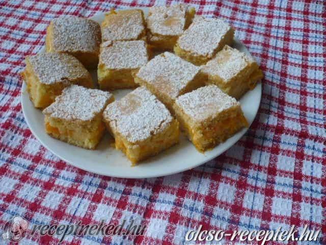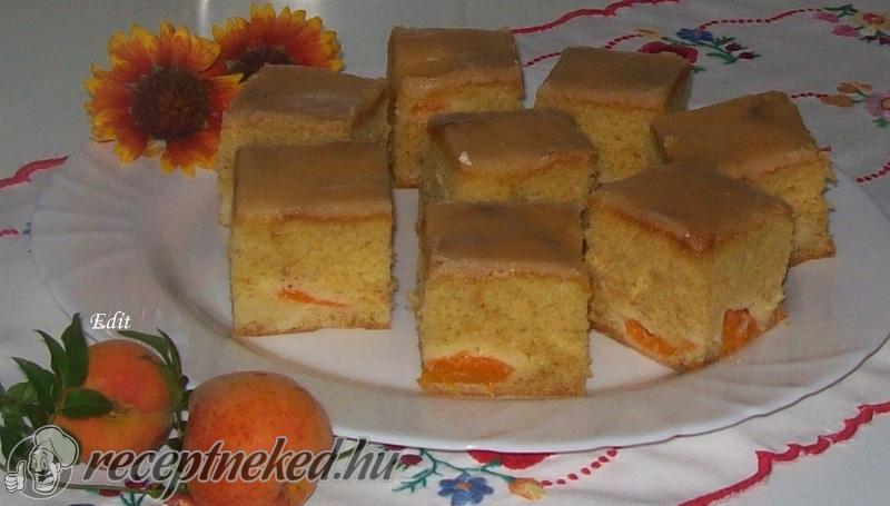 Sütőpapírral bélelt tepsibe (20*30 cm) öntjük a masszát, majd a barack darabokat rászórjuk.