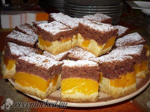 Kivesszük a sütőből a barackos tésztát, megszórjuk fahéjjal és cukorral, majd ráöntjük a piskótát a tetejére. Visszatesszük a sütőbe és további 20 percig sütjük kb.