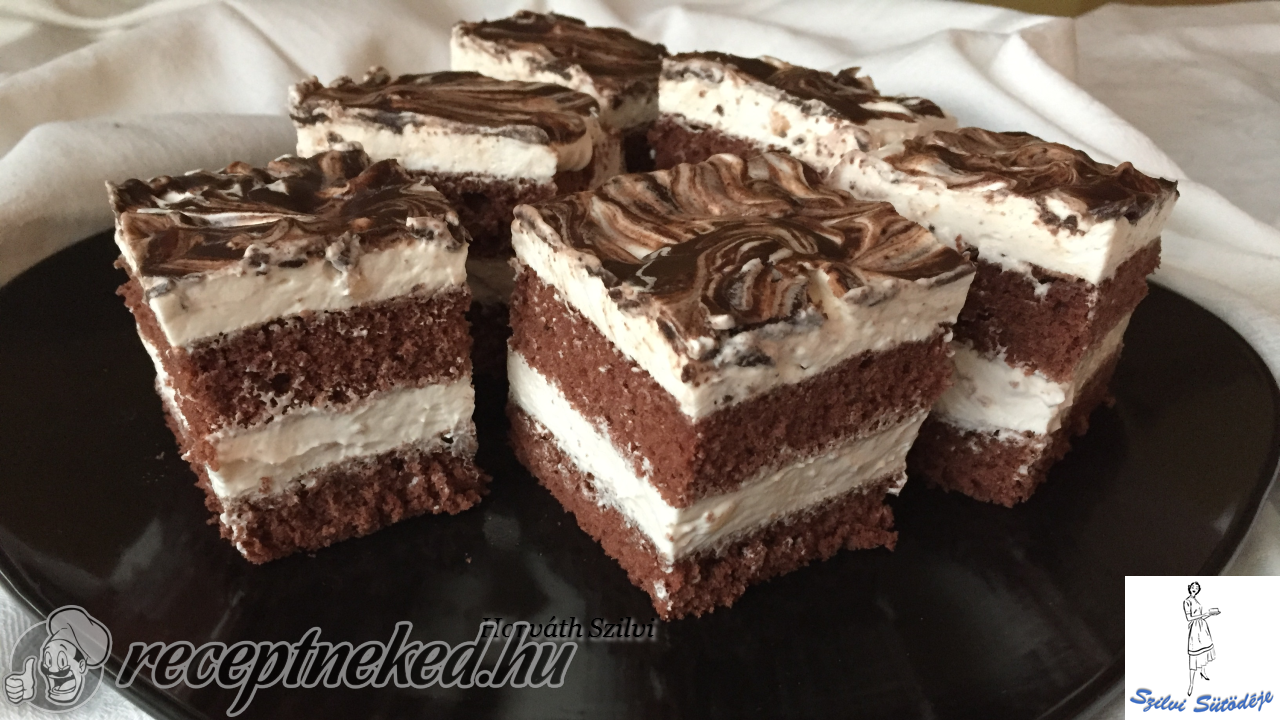 A felső tésztához a tojásokat szétválasztjuk. A fehérjét kemény habbá verjük. A sárgájához hozzáadjuk a cukrot, az olajat és géppel pár percig keverjük, majd mehet bele a kakaópor, a liszt, a sütőpor, végül óvatosan a hab (ez egy kakaós piskóta).