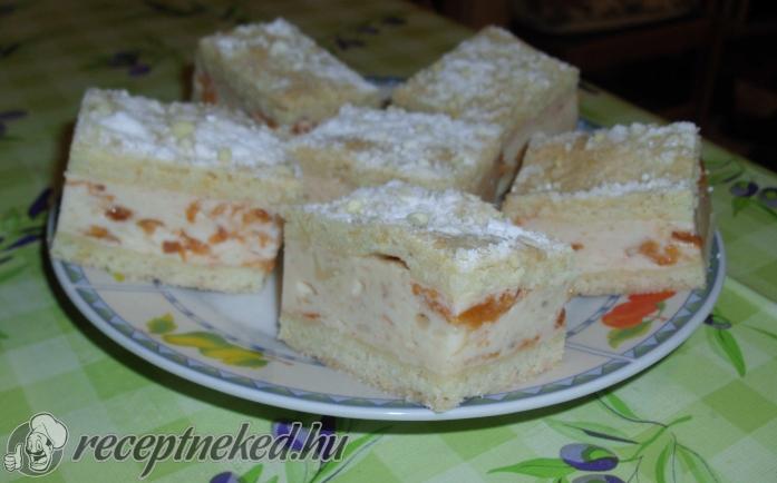 A mascarponét összekeverjük a cukorral, majd egyesével belekeverjük a tojásokat és a vaníliát. Ezt a masszát rásimítjuk az elősütött alapra, majd rátesszük a citromlével és szerecsendióval elkevert barackot.