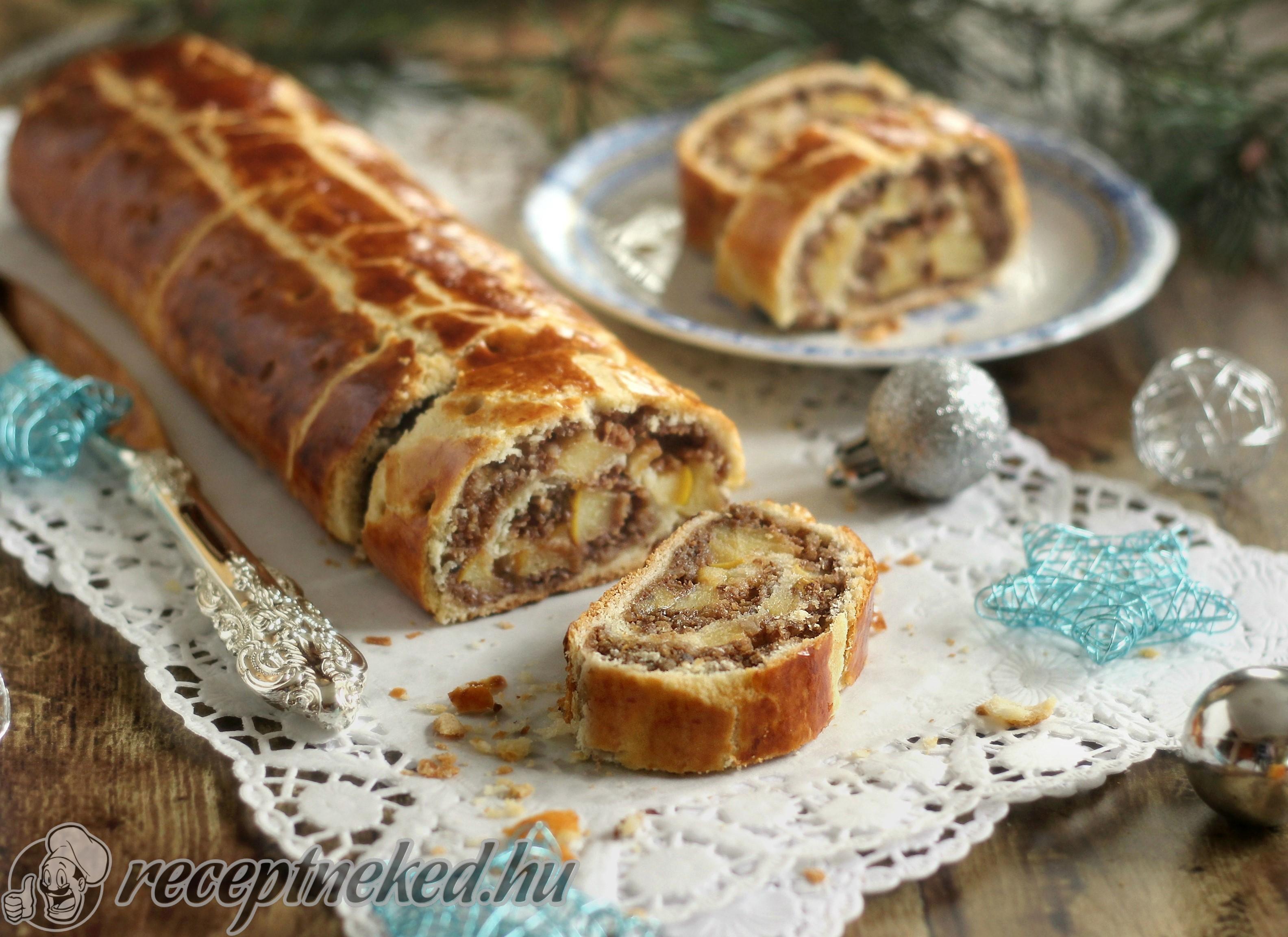 A pihentetett tésztát két részre osztjuk és egyenként körülbelül 30*22 cm-es nagyságúra nyújtjuk, lisztezés nélkül. A diós töltelék felét a tésztára kenjük, körben 2 cm szegélyt szabadon hagyva. Rászórjuk a keményítővel elkevert birs felét. A tészta két rövidebb és egy hosszabb oldalát ráhajtjuk a töltelékre, majd a hosszabbik oldalától kezdve feltekerjük. Ugyanígy járunk el a másik tésztával is.