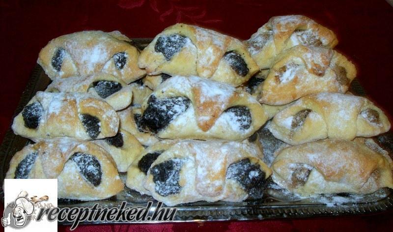 Kinyújtjuk és négyszögekre vágjuk. Diós töltelékkel megtöltjük, és átlóban feltekerjük, kifli formájúra igazítjuk.