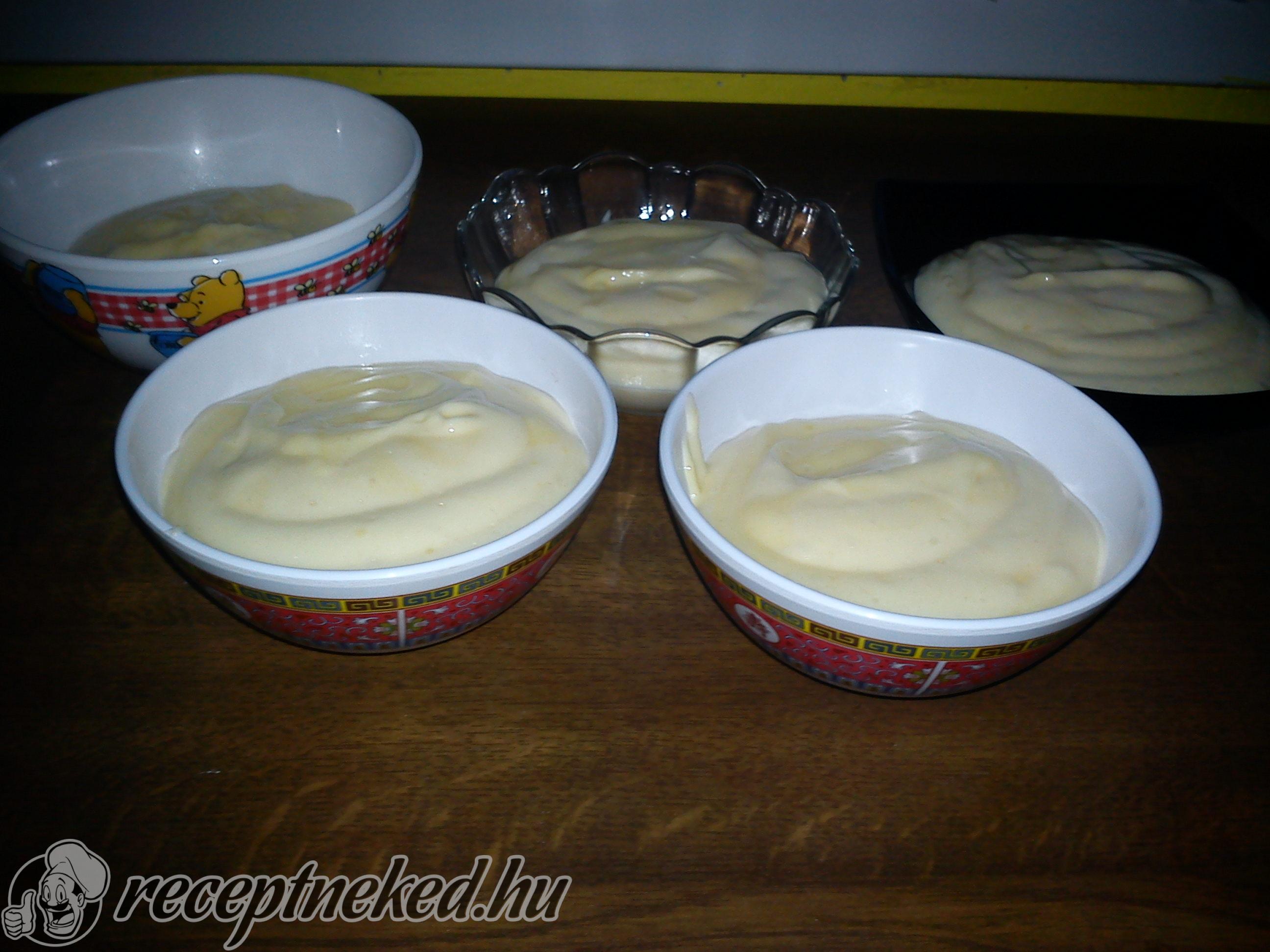 A krémhez a pudingport elkeverjük a két féle cukorral, pár kanál tejjel, majd hozzáadjuk a tej többi részét és folyamatos keverés mellett, lassú tűzön nagyon sűrű krémet főzünk belőle.
