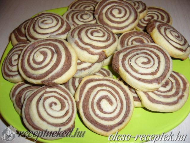 Nagyjából összegyúrjuk a hozzávalókat, kivéve az utolsó 4 összetevőt. Ezután kétfelé vesszük a tésztát. Az egyik felébe beledolgozzuk a 2 dkg kakaóport, a másik felébe a vaníliás cukrot és a citrom reszelt héját. Mindkét tésztát vékony téglalap alakúra nyújtjuk, megkenjük tojásfehérjével, egymásra fektetjük, és feltekerjük. 2-3 órára hűtőszekrénybe tesszük pihenni. Végül a tekercset fél centiméter vastag szeletekre vágjuk, és sütőpapírral bélelt tepsire rakva, 180 fokra előmelegített sütőben 12-15 perc alatt megsütjük.