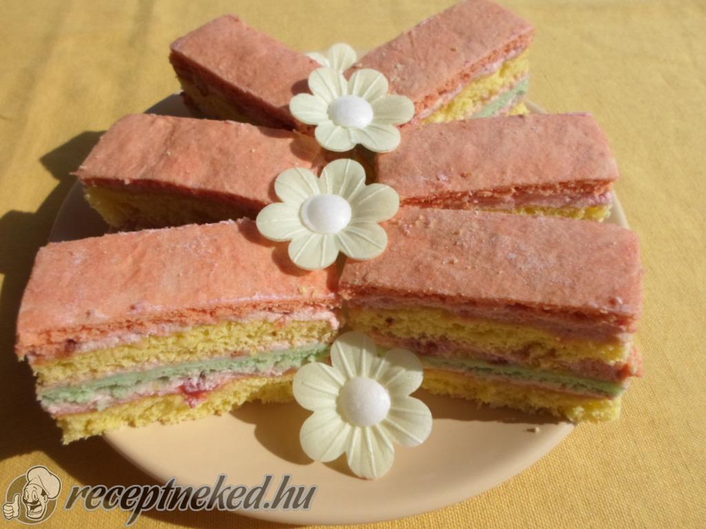 A piskótára kenjük a krém egy részét, erre jön a zöld lap, ismét krém, piskóta, maradék krém, végül a piros lappal befedjük.