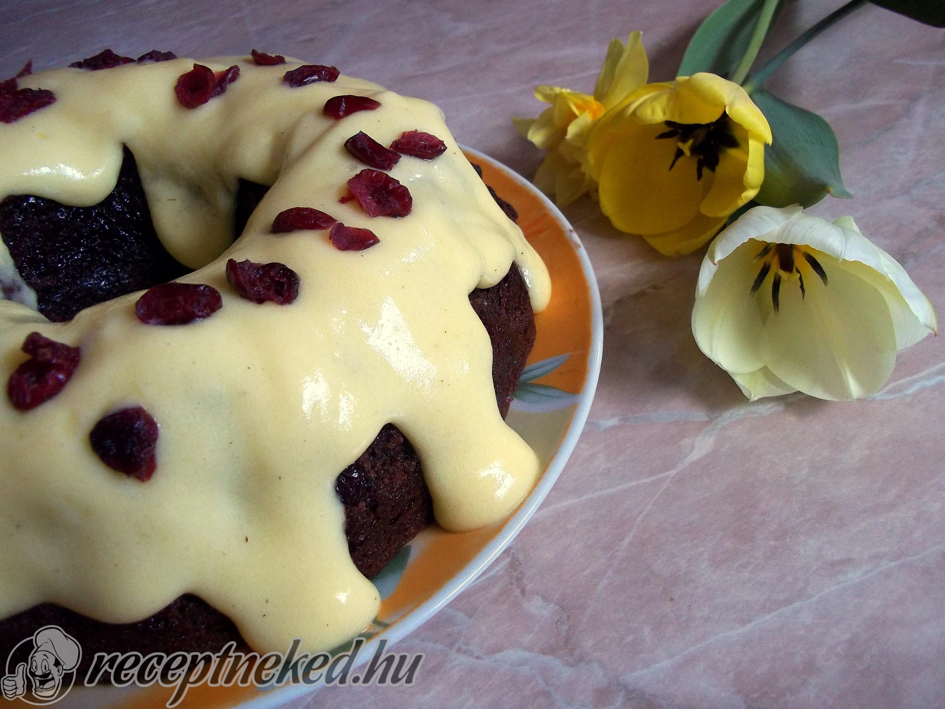 Először a sima tészta felét öntsük a kuglófformába, utána a kakaósat, a tetejére pedig a maradék sárga massza kerül. Villával kicsit össze is keverhetjük.