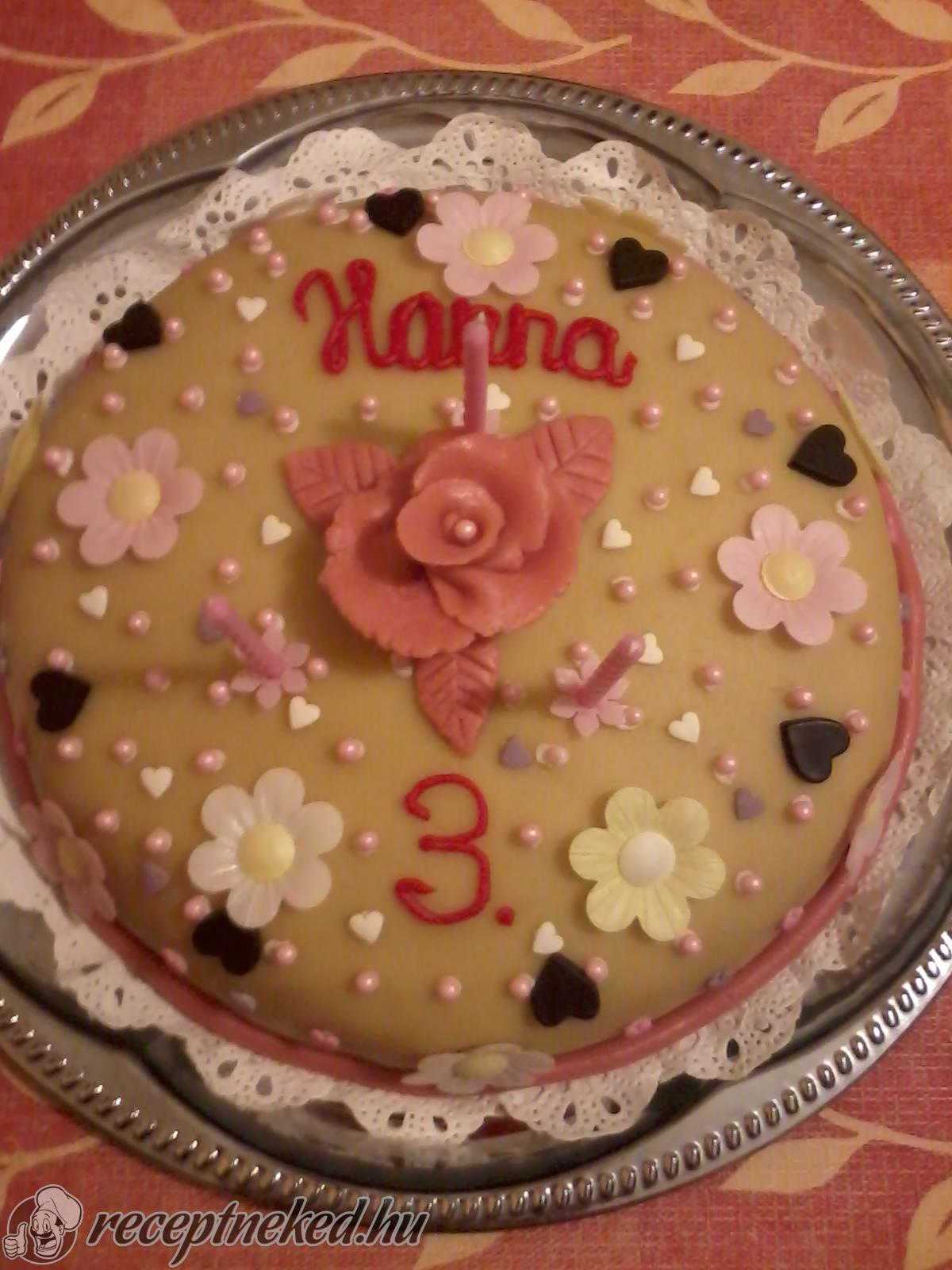 Mivel marcipánnal vontam be, a tortát kívülről is bekentem egy kicsit a krémmel. Kinyújtottam a marcipánt, majd óvatosan a tortára helyeztem és szépen elsimogattam, hogy egyenletes legyen. A feleslegesen lógó marcipánt éles késsel lekanyarítottam a torta körül. A rózsát szintén marcipánból készítettem. Majd ehető díszekkel díszítettem.