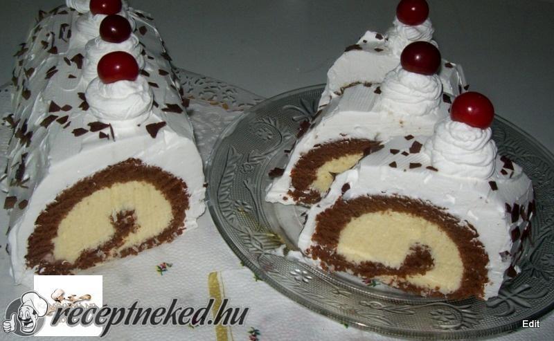 A krém 2/3-át elkenjük a tésztán és feltekerjük a tekercset. A tekercset a feltekerés után lassan eltávolítjuk a sütőpapírról. A tekercsen elosztjuk a maradék krémet és hűtőbe tesszük dermedni legalább 1 órára.