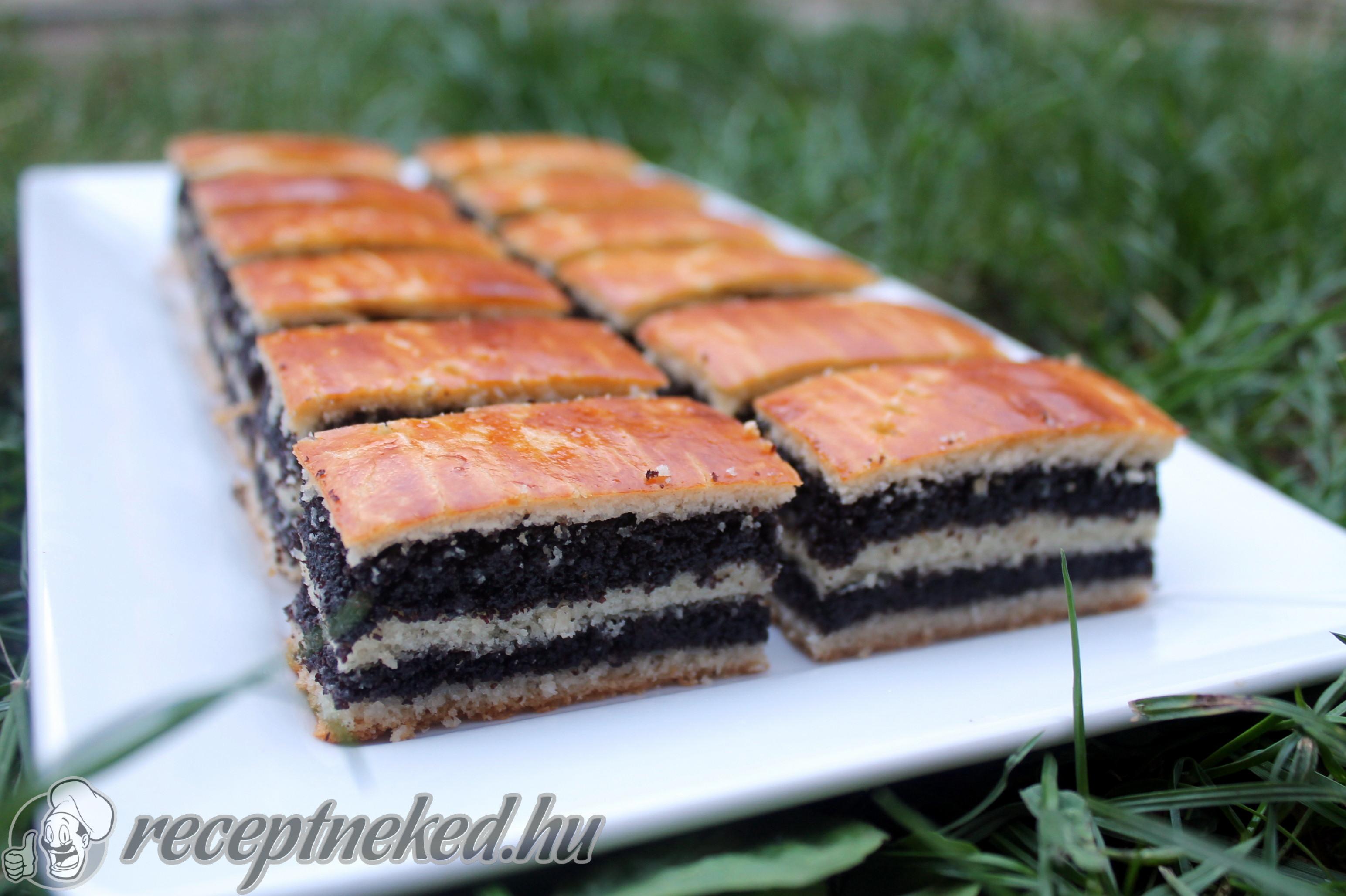 Az egyik tésztacipót tepsi méretűre nyújtom, nem kell alálisztezni a nyújtáshoz, nem szabad, hogy ragadjon a tészta. Az első tésztalapot beleteszem a sütőpapírral bélelt tepsibe, ezután ráhalmozom és elegyengetem a máktöltelék felét, majd ráteszem a következő kinyújtott tésztalapot, a máktöltelék másik felét és befedem az utolsó kinyújtott tésztalappal.