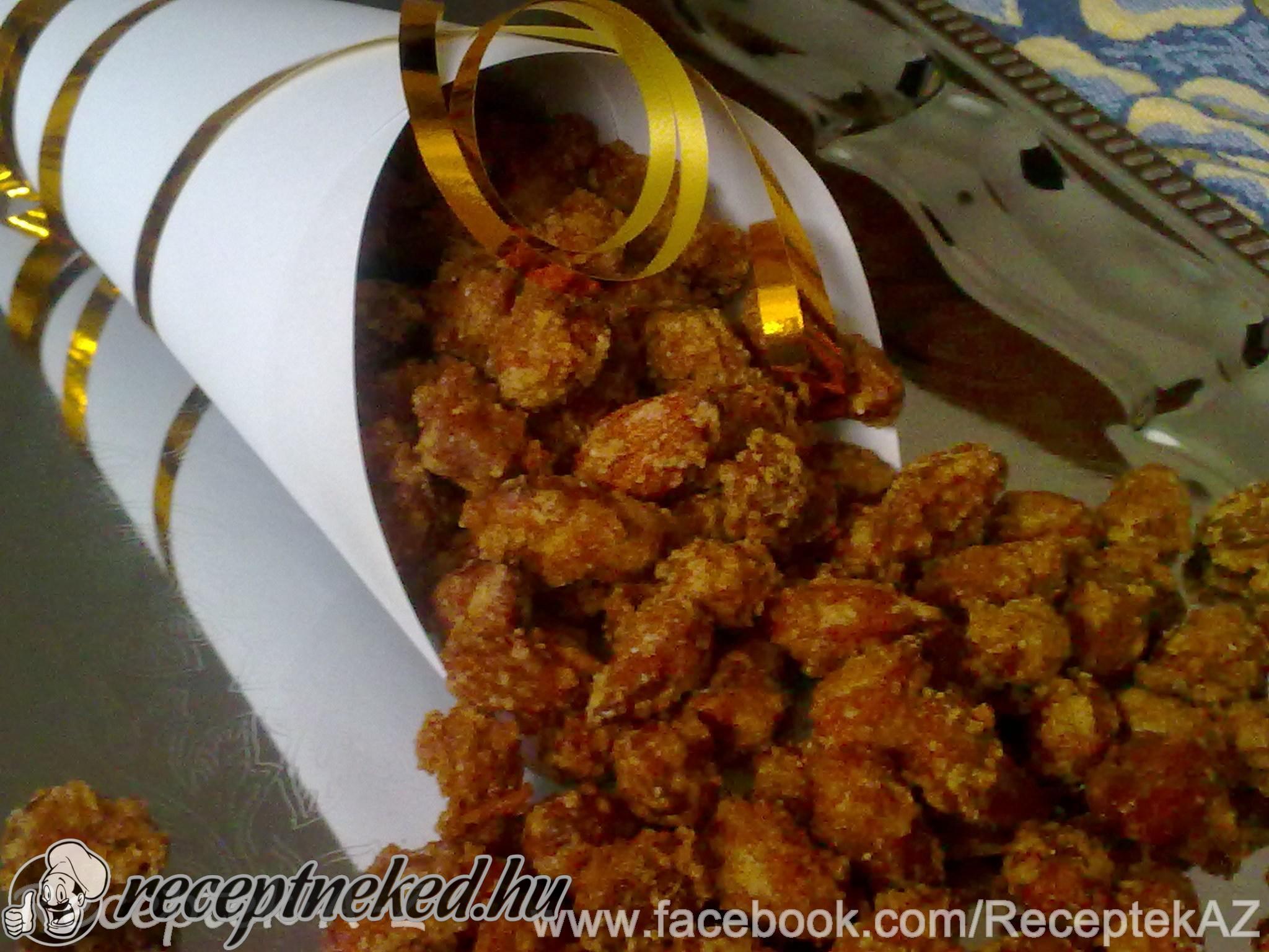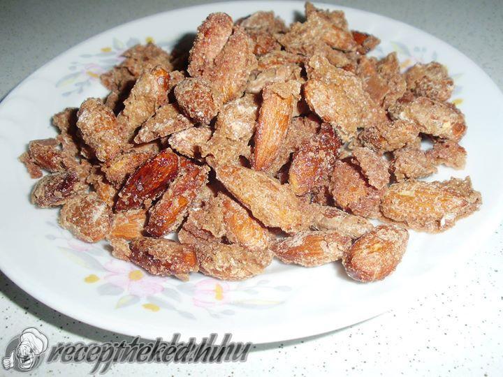 A tojásfehérjét elkeverjük a hideg vízzel és a csipet sóval. Villával enyhén felverjük, nem is verjük, inkább csak felhabosítjuk. Ebbe a keverékbe belerakjuk a mandulát és alaposan beleforgatjuk, győződjünk meg róla, hogy minden szemet bevont a fehérje.