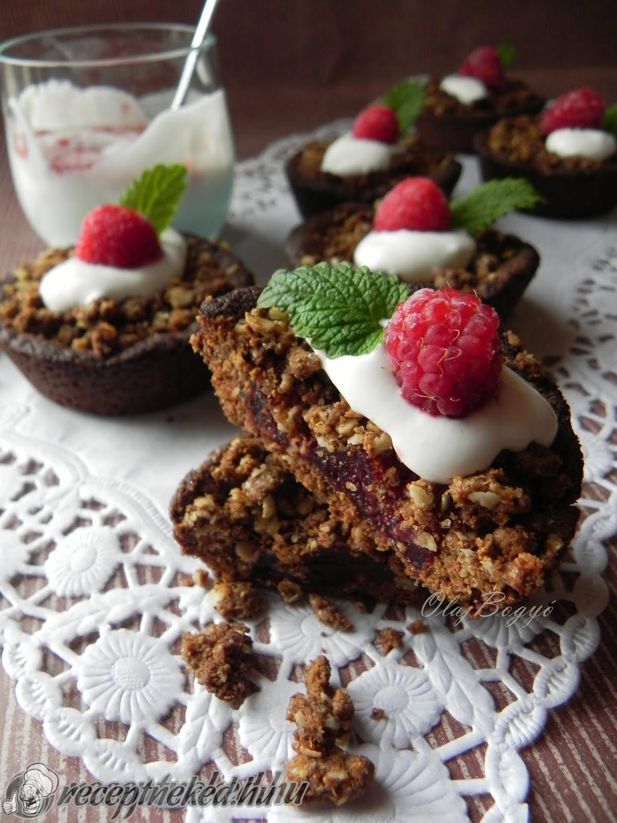 A kihűlt mini pitéket tejfölös öntettel és málna szemekkel díszítve tálaltam.