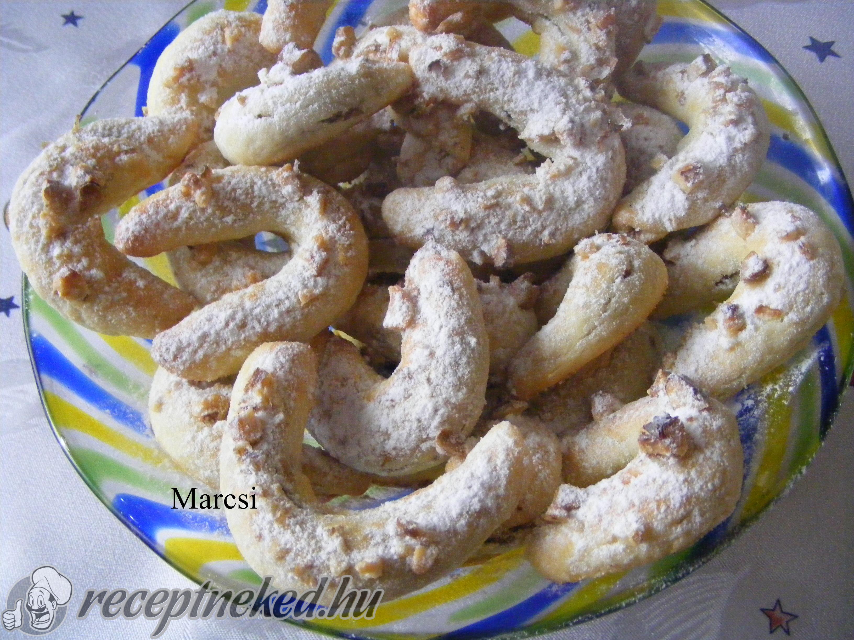 Két részre osztjuk a tésztát. Az egyiket kinyújtjuk kerekre, mint a pizzát, vékony haromszögekre vágjuk, a széles végébe belenyomkodjuk a diót és feltekerjük kis kifliknek.