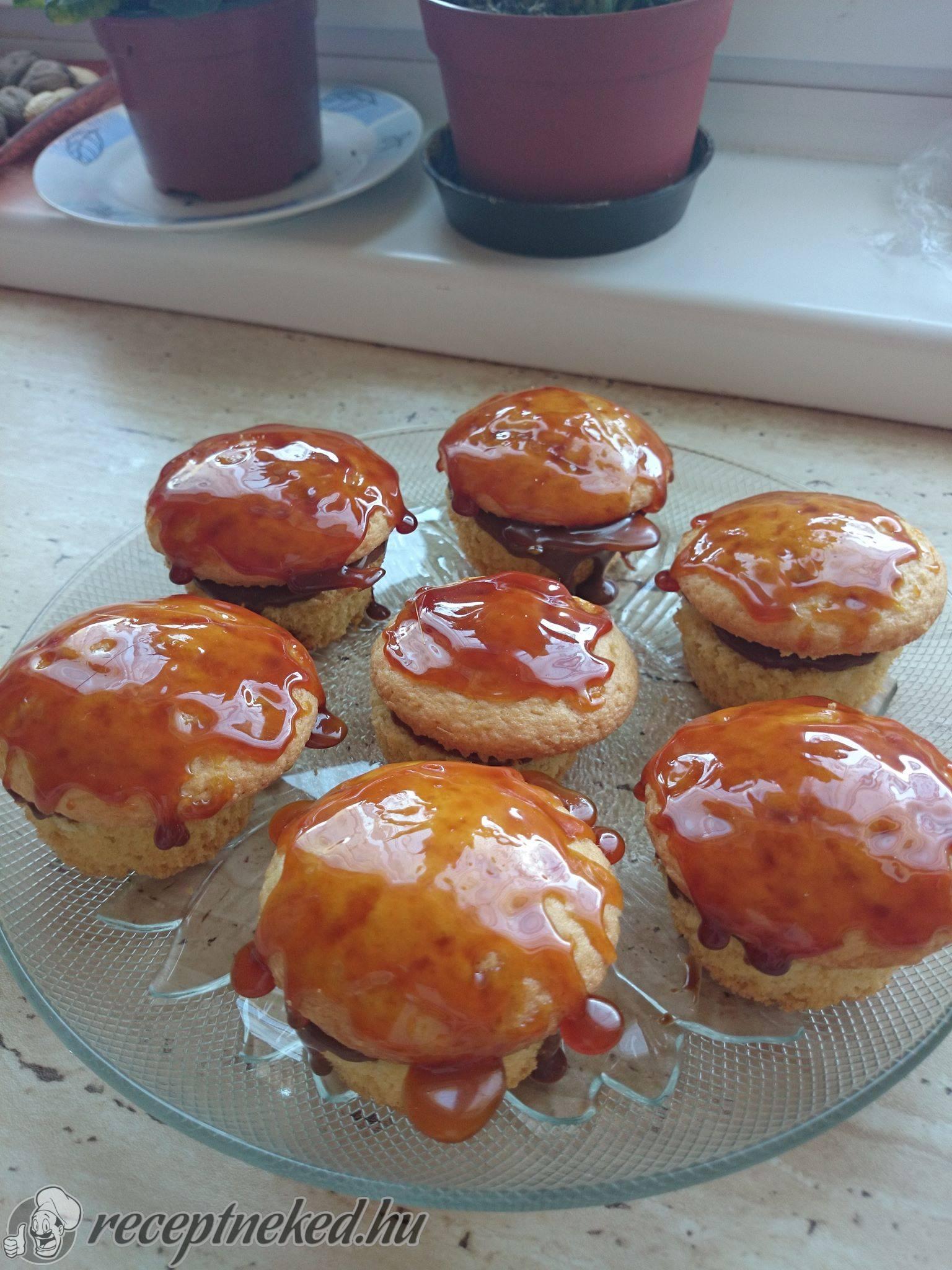 A muffinok tetejét levágjuk, a 10 dkg cukorból karamellát készítünk és a muffinok tetejét bevonjuk vele.