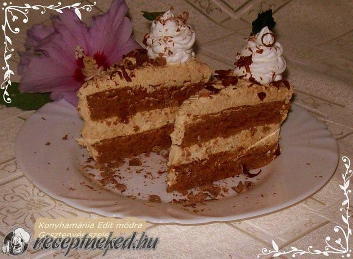 A lapot kettévágjuk, majd a krém kb 2/3-ad részét beletöltjük. Rátesszük a másik lapot, rákenjük a maradék krémet. Ízlés szerint húzhatunk bele hullámokat. Kb 1 órára hűvös helyre tesszük dermedni.