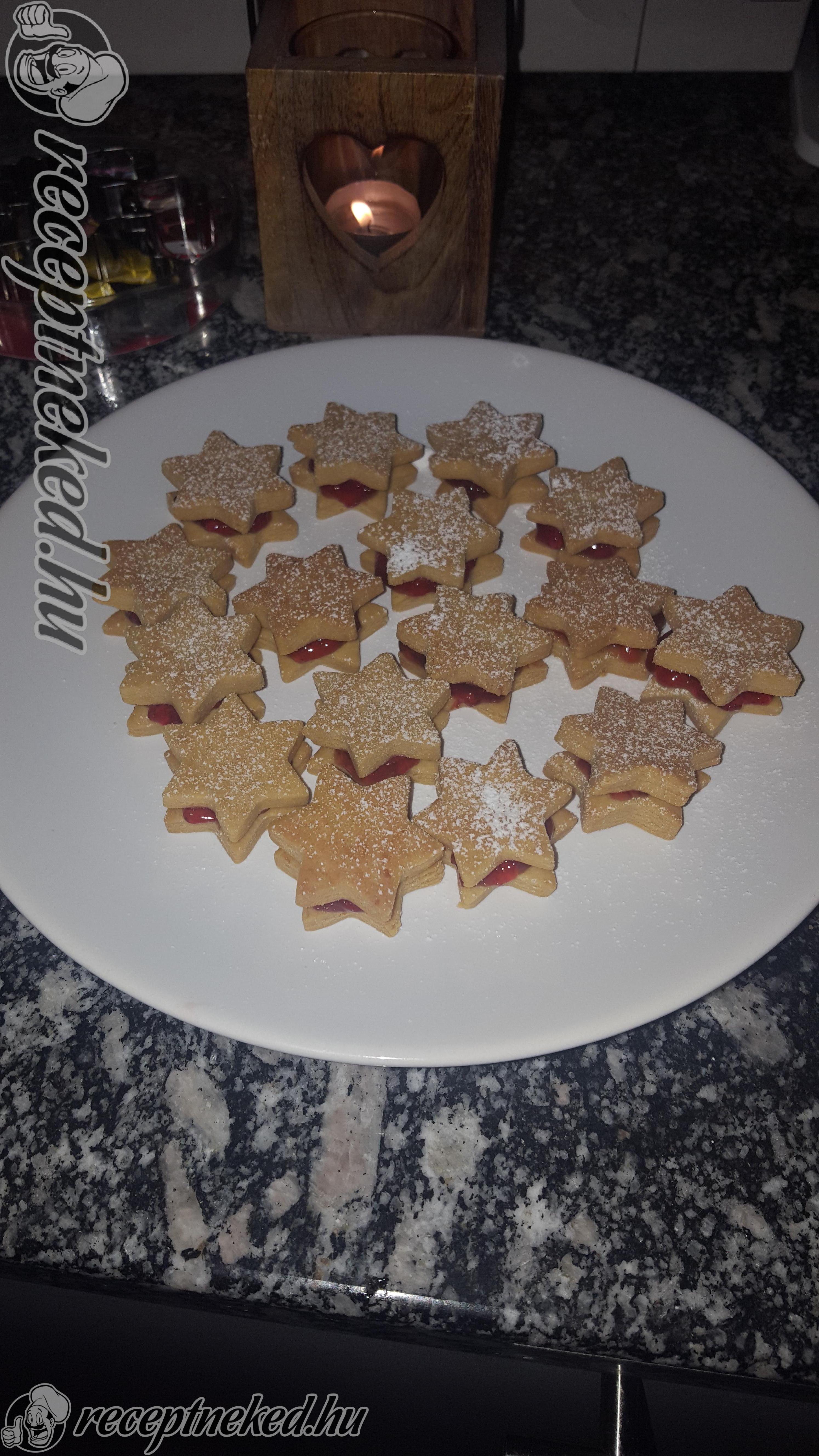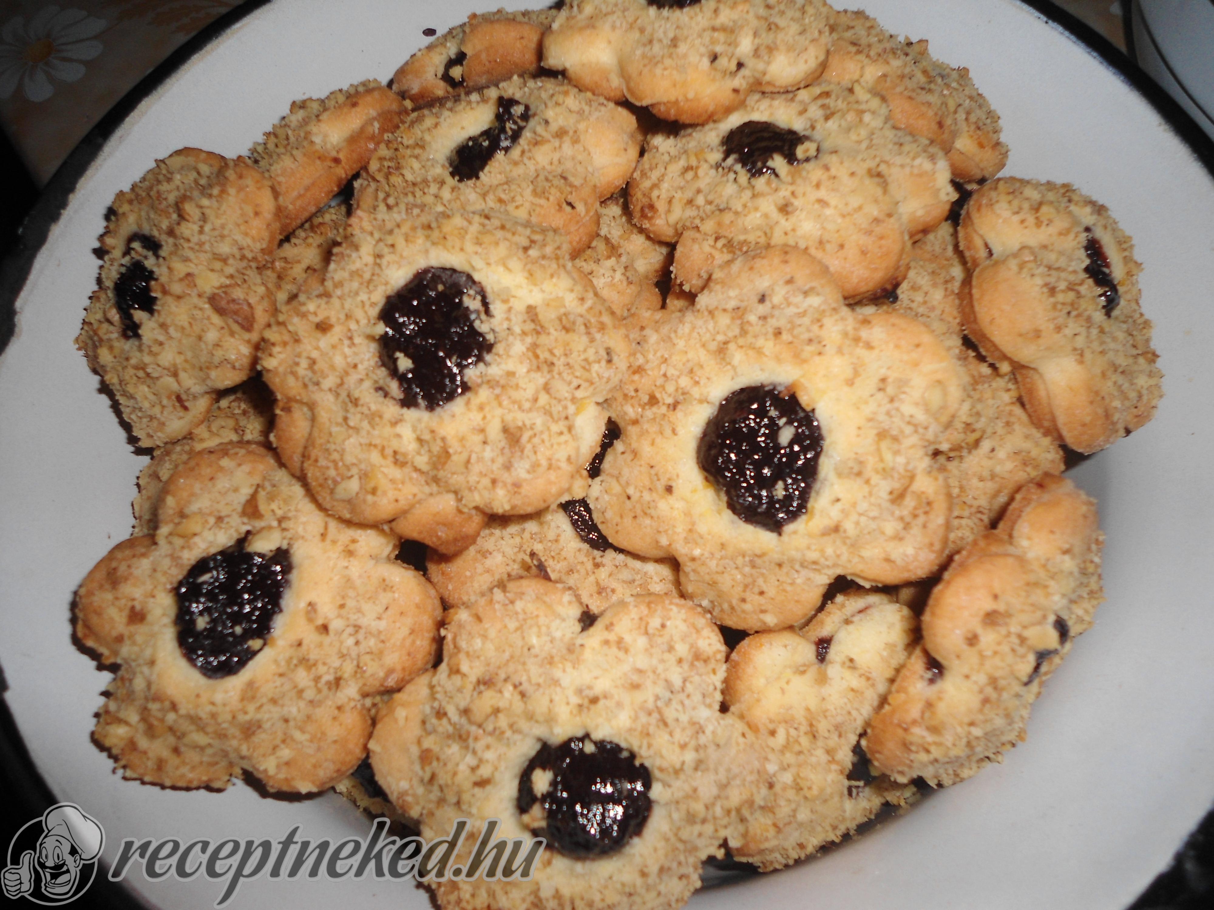 Sütőpapírral bélelt tepsire tesszük, majd 180 fokra előmelegített sütőben körülbelül 8-10 percig sütjük. Hagyjuk kihűlni, majd lekvárral töltjük és porcukorral megszórva tálaljuk.