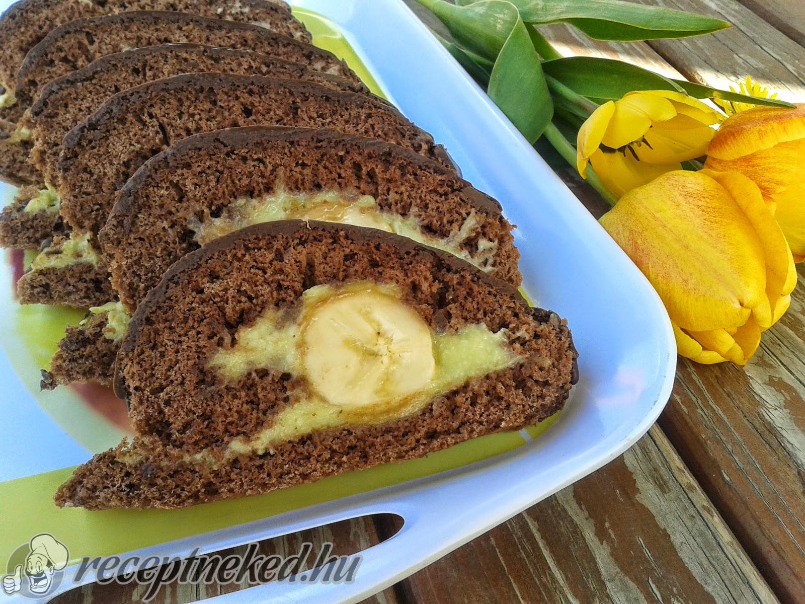 A tésztát kiterítjük, egyenletesen rákenjük a krémet. Hosszanti oldalára ráteszünk két banánt egymás mellé, erre is kenünk kevés krémet, majd feltekerjük.