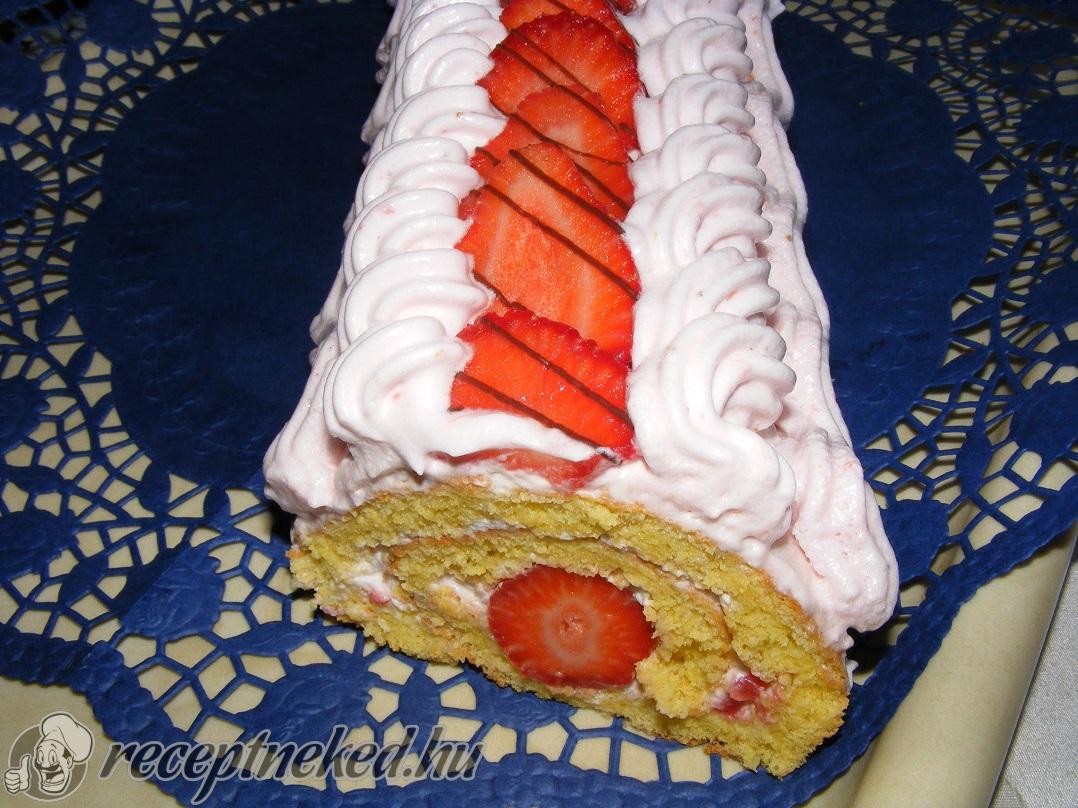 A krémhez 15 dkg epret összeturmixolunk, majd a tejszínt a porcukorral és az összeturmixolt eperrel kemény habbá verjük. A krém 3/4-ét egyenletesen rásimítjuk a kitekert piskótalapra. A hosszabbik oldala mentén egy sorban elhelyezzük a maradék eper felét, egész vagy felezett szemekkel, majd szorosan feltekerjük.