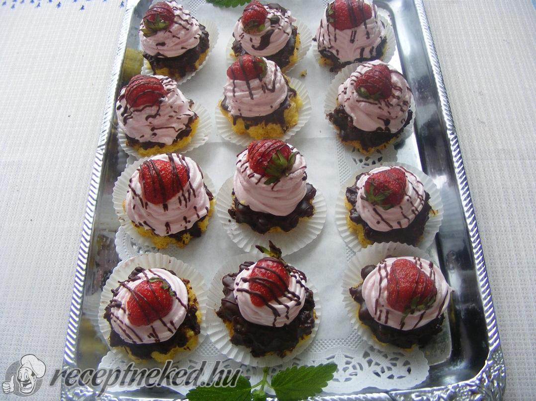 A habot habzsákba töltjük, majd a csokiba mártott piskótalapokra halmozzuk. A tetejére félbevágott eperszemeket helyezünk, végül olvasztott csokoládéval finoman meglocsoljuk.