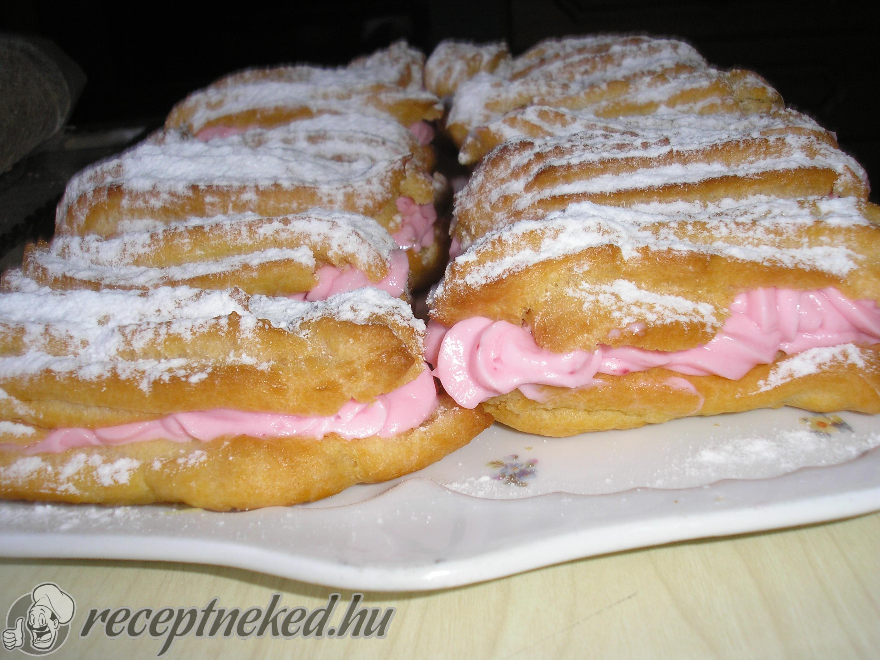 A tésztát ketté vágjuk, habzsákból a tésztára nyomjuk a krémet. Rátesszük a tetejét, és porcukorral megszórjuk.
