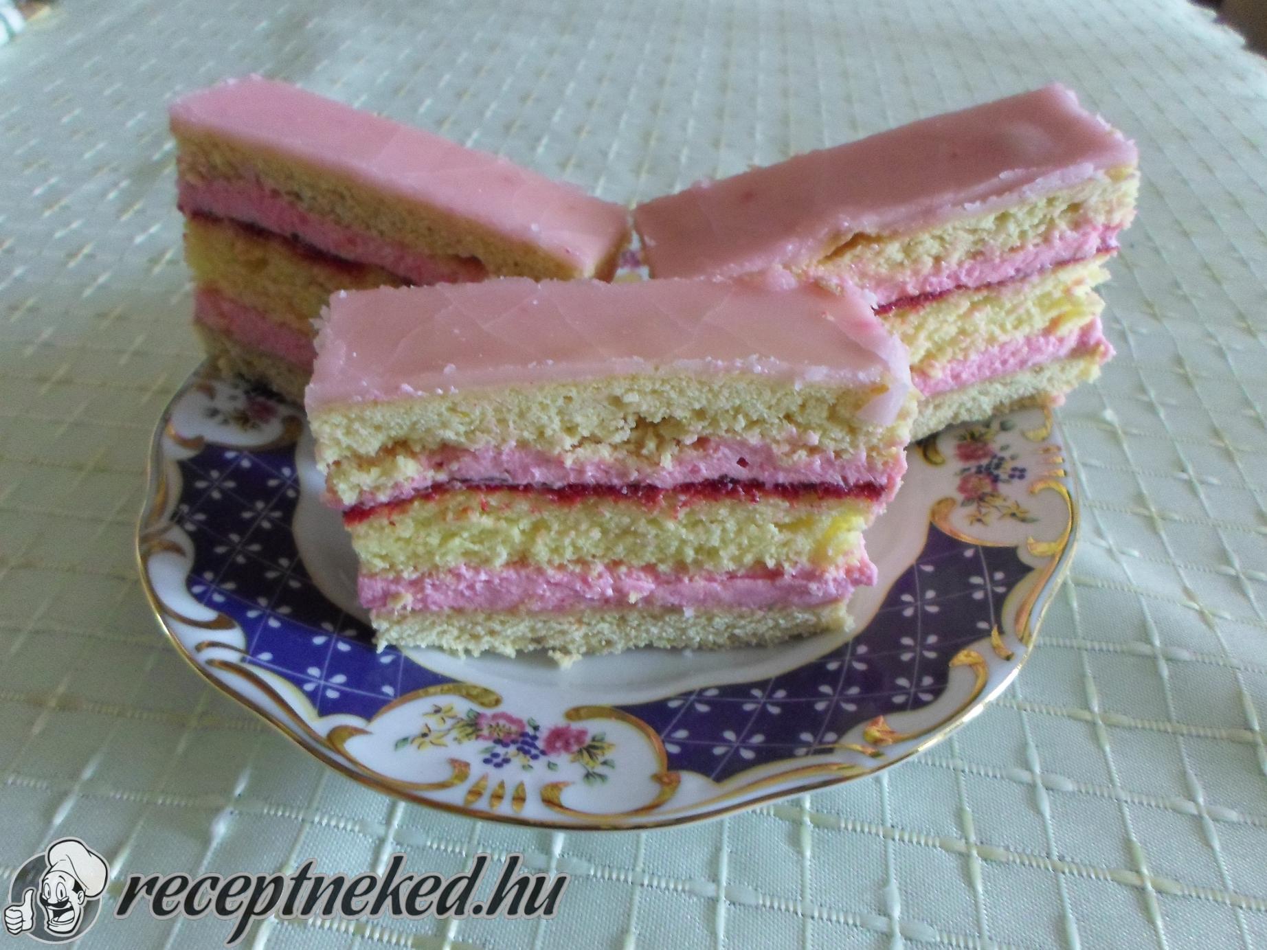 Az alsó lapot megkenünk egy réteg krémmel, rátesszük a második lapot. Ezt megkenjük a lekvárral amire a maradék krémmel és rátesszük a harmadik krémet.