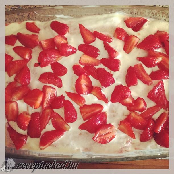 Úgy gazdálkodjunk az alapanyagokkal, hogy a tetejére ismét krém kerüljön. Végül az elején félretett, felszeletelt epret a tetejére szórjuk.