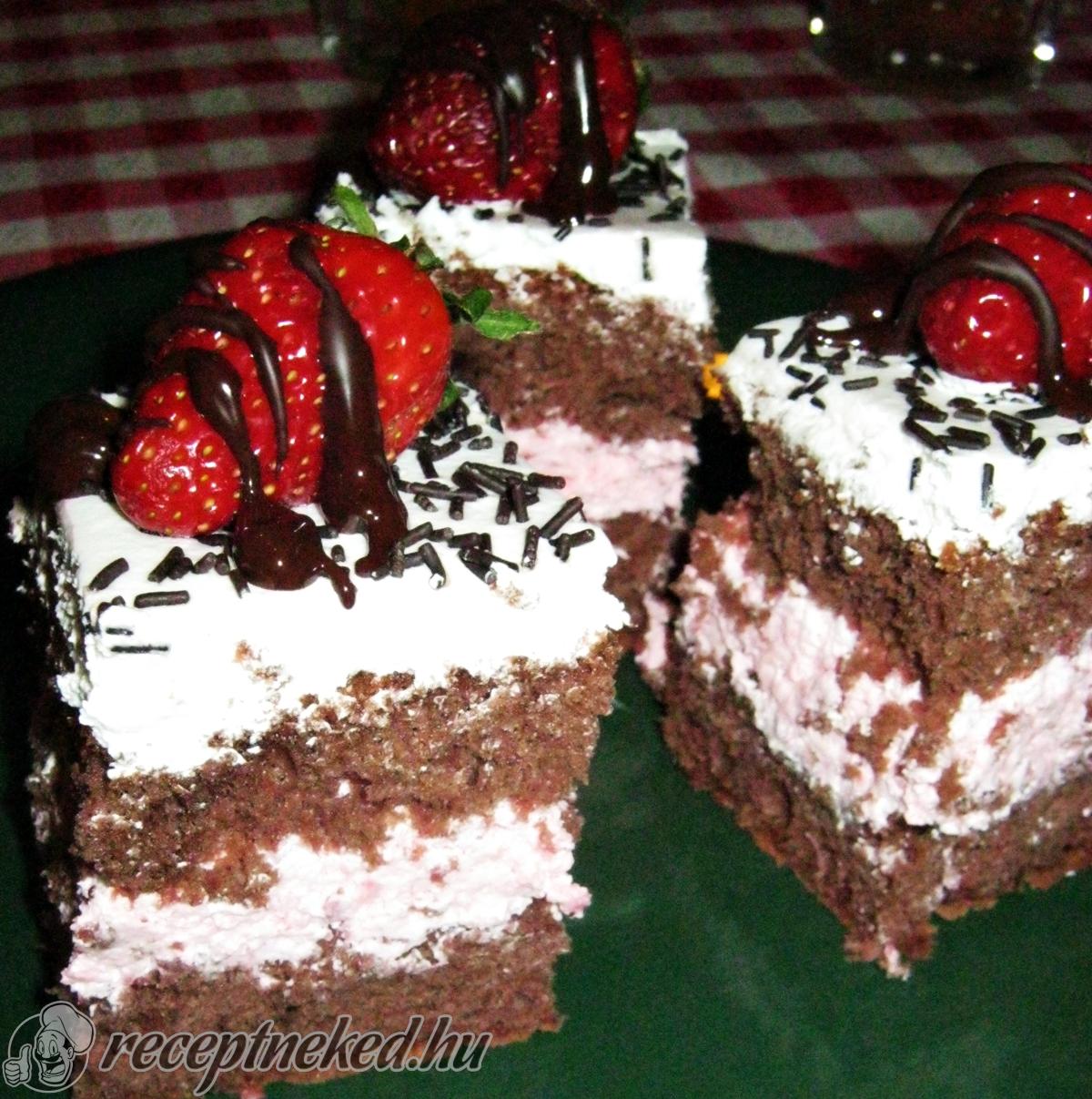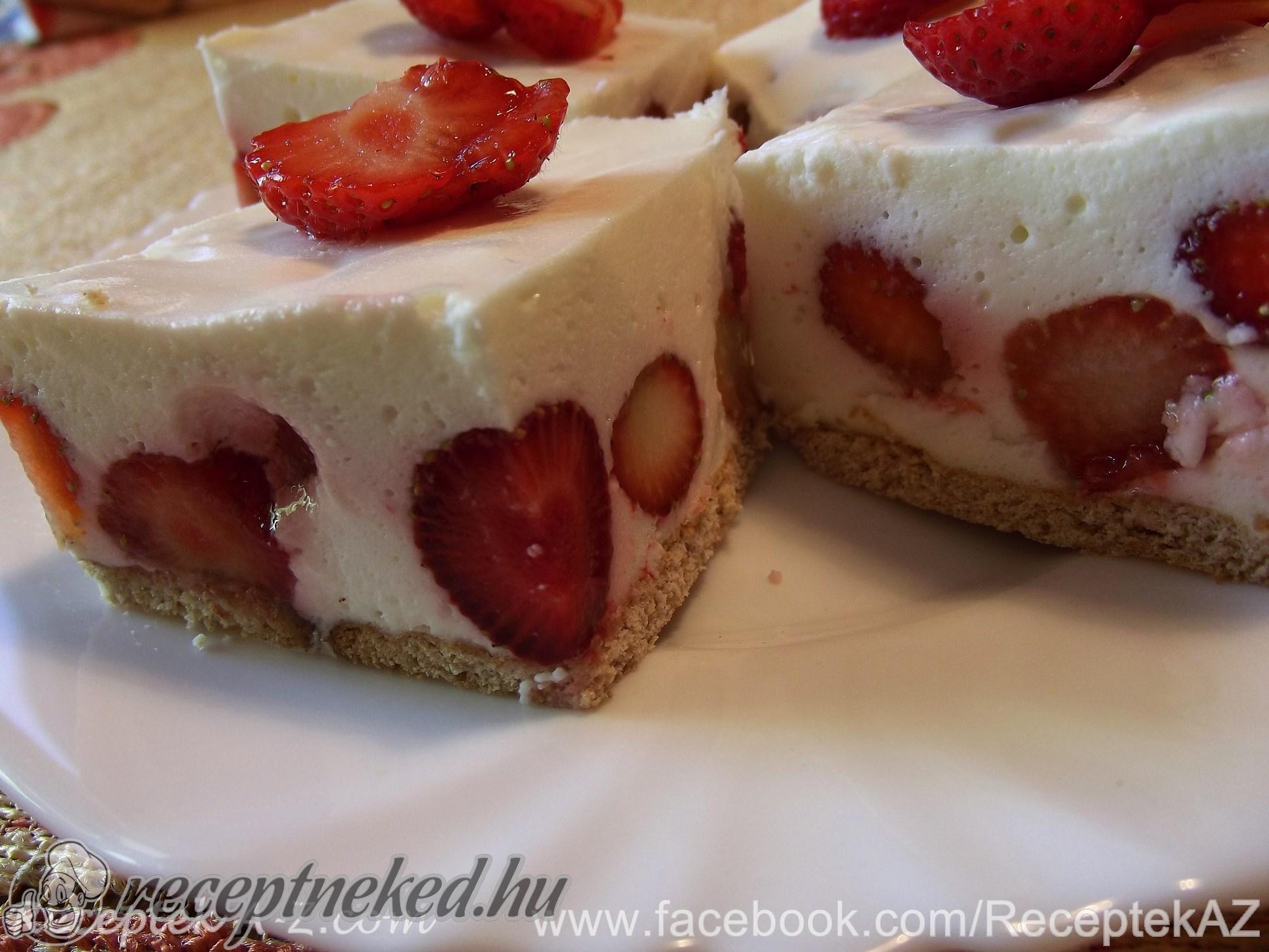 A lap köré tegyünk sütemény keretet ha nem elég magas falú a tepsink, majd erre kenjük rá az epres krémet. Kenjük rá a fehér csokis krémet, majd az egészet tegyük pár órára hűtőbe.