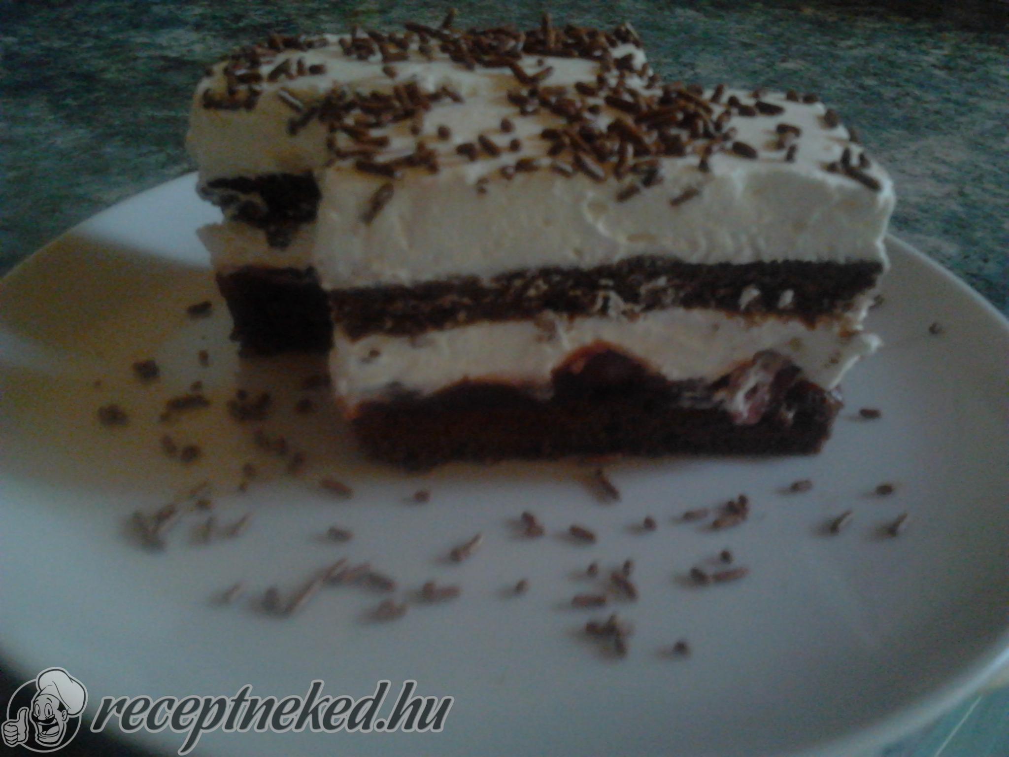 Az alsó lapot meglocsoljuk a rumaroma felével. A meggyet leszűrjük, levét felfogjuk, és ha nincs 4 dl, vízzel kiegészítjük. A levet egy csomag pudingporral és 4 evőkanál porcukorral simára keverjük, majd kis lángon sűrűre főzzük. A maradék rumaromát is hozzákeverjük. Az alsó lapra öntjük a krémet, és egyenletesen megszórjuk a meggyel.