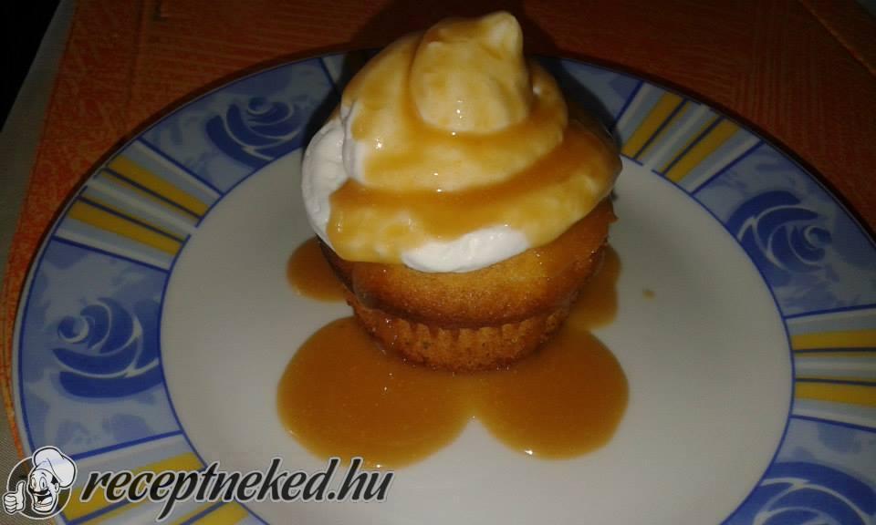Az elkészült cupcake-ek tetejére karamellszószt csorgatunk, és megszórjuk vajkaramella darabkákkal. (12 db lesz belőle.)