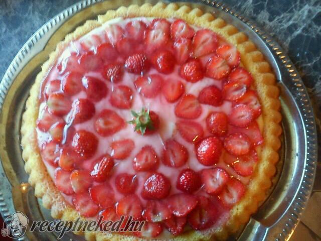 Rétegezzük a tortát: habzsákba töltjük a vaníliás krémet, majd körbe 8 nagy, közéjük 8 kicsi halmocskát nyomunk. Körben egy-egy halmon elhelyezünk 8 szelet epret, majd a közepébe körkörösen egy kis krémet nyomunk. Jöhet a tetejére a második lap, ugyanígy járunk el vele, majd a harmadikkal is, végül ráhelyezzük a negyedik lapot.