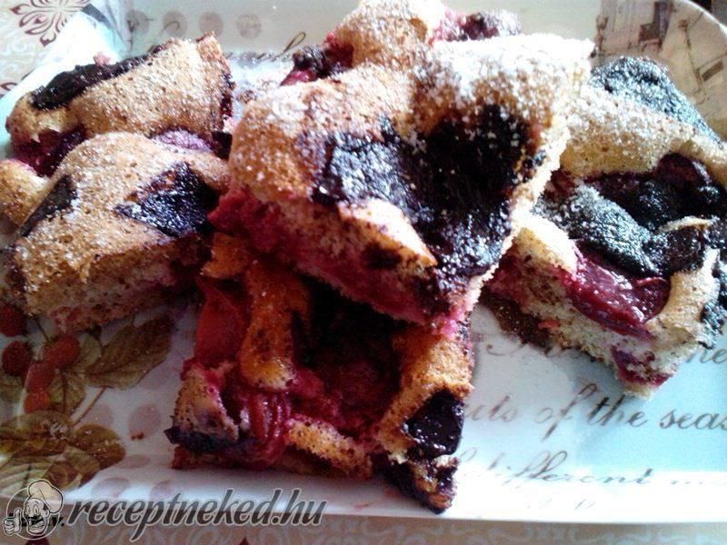 Kivajazunk és lisztezünk egy 25*25 cm-es tepsit vagy sütőformát és a masszát beleöntjük, majd elsimítjuk. Megszórjuk a gyümölcs darabokkal, csokoládé darabokkal és alacsony lángon, 160 fokra előmelegített sütőben megsütjük szép pirosra kb 30 perc alatt. Tűpróbát végezzünk!