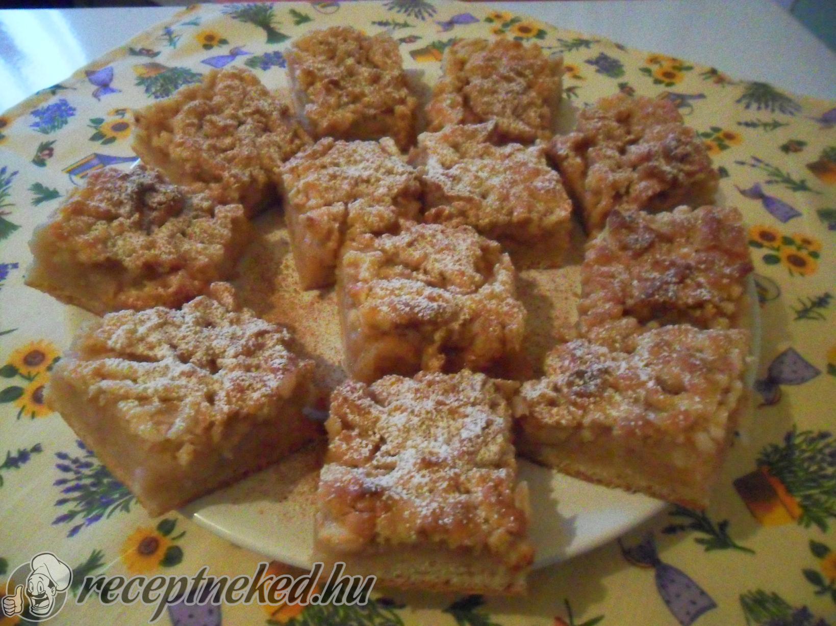 A tésztát kinyújtjuk és közepes méretű (25*35 cm) tepsibe tesszük. Erre ráhalmozzuk az almás tölteléket.