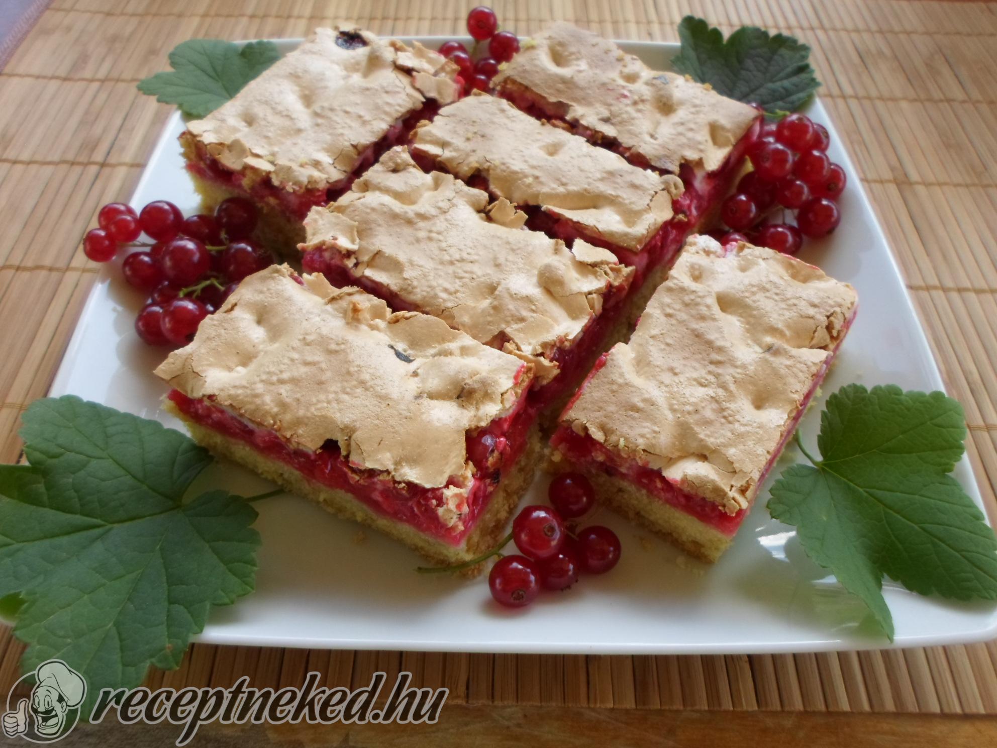 Az 5 db tojásfehérjét 20 dkg cukorral habbá verjük, a ribizlit beleforgatjuk, majd a tészta tetejére tesszük, és tovább sütjük, amíg a tojáshab szép aranyszínű lesz.