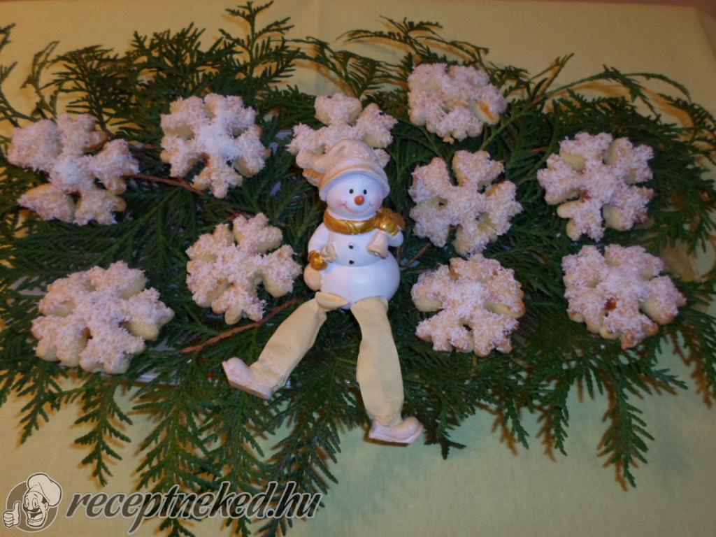 A tésztát enyhén lisztezett deszkán kinyújtjuk. Hópehely formájú kiszúróval kiszaggatjuk.
