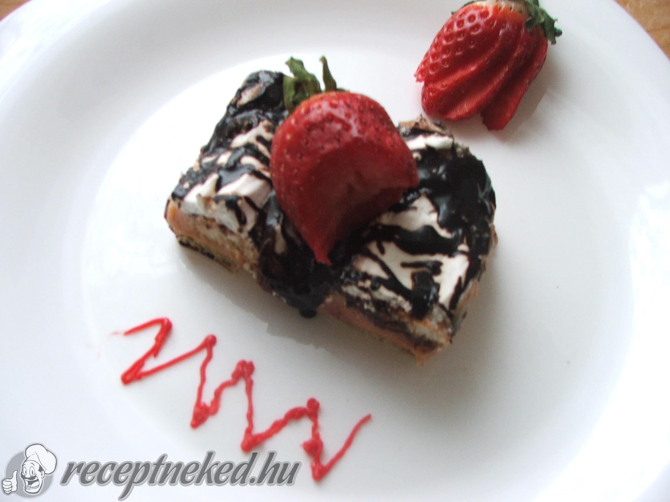 A kakaóból, cukorból és tejből kis lángon csokiöntetet készítünk, és ezzel meglocsoljuk a sütemény tetejét. Hűtőbe tesszük, hogy az ízek összeérjenek. Jó étvágyat kívánunk!