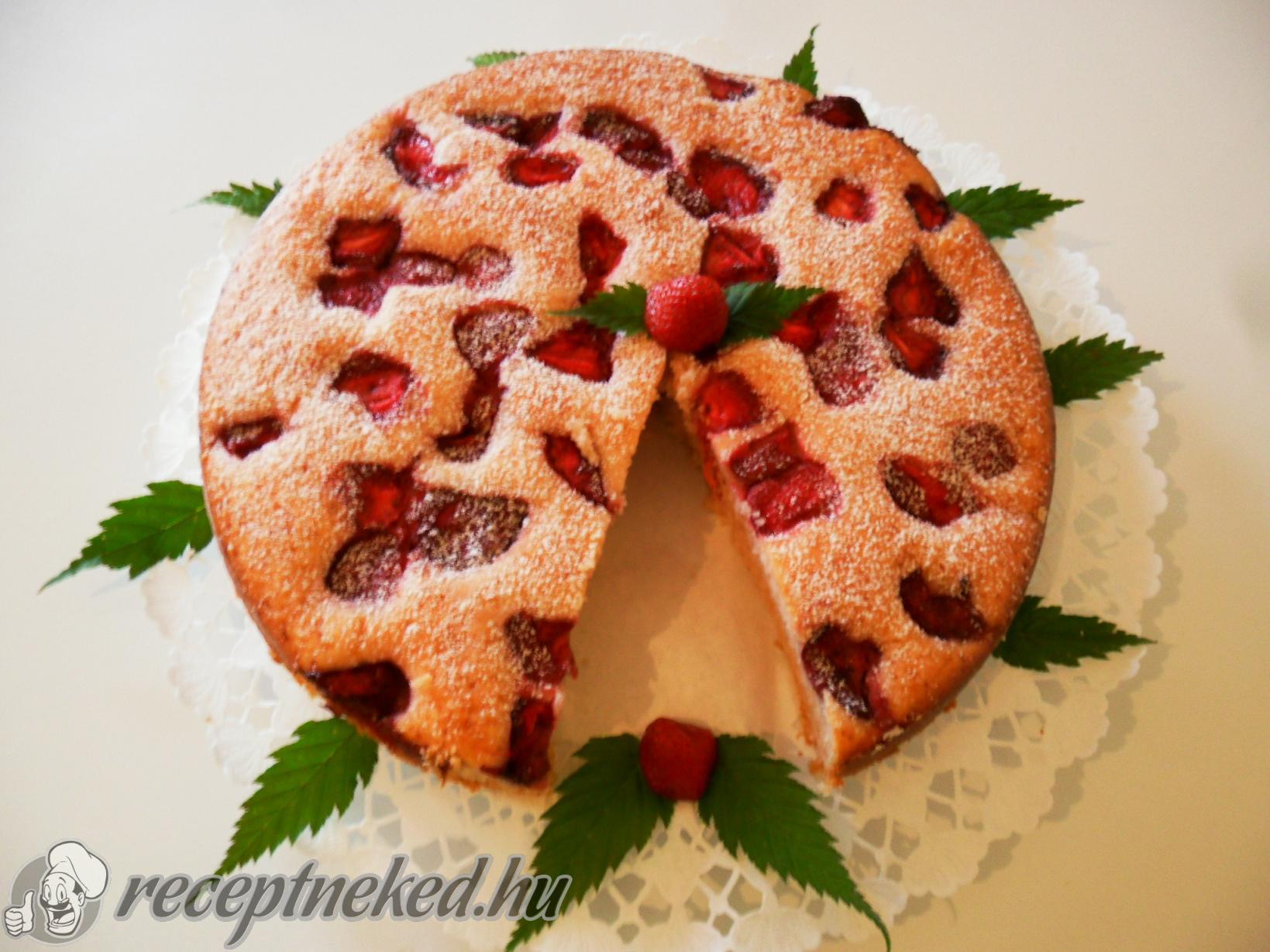 Margarinnal kikent, liszttel megszórt tortaformába öntjük, és a tetejére eperdarabokat szórunk. Előmelegített sütőben, alacsony hőfokon, 40 percig sütjük.